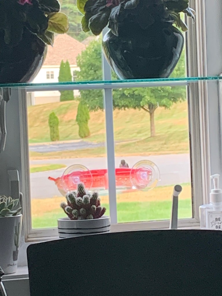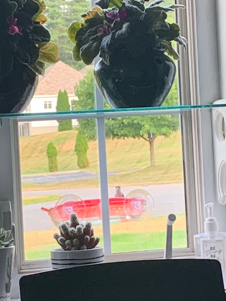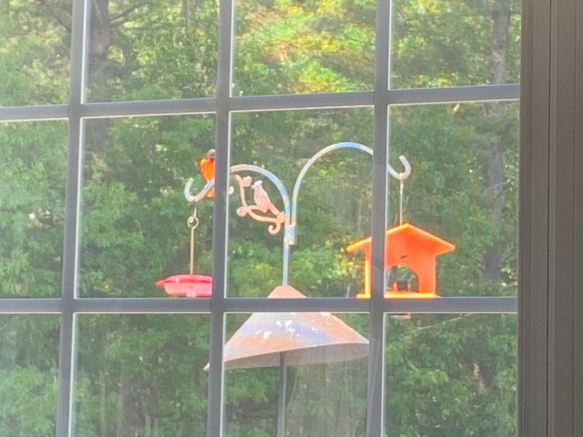 My husband makes sure that all the bird feeders are full. This is quite a job since he has four hummingbird feeders, one Baltimore Oriole feeder, one bluebird feeder, and three other feeders with seeds or seed cakes. It is a full-time job for him. I’m not counting what he has to do to take care of our tropical and freshwater fish! That’s another post coming up.