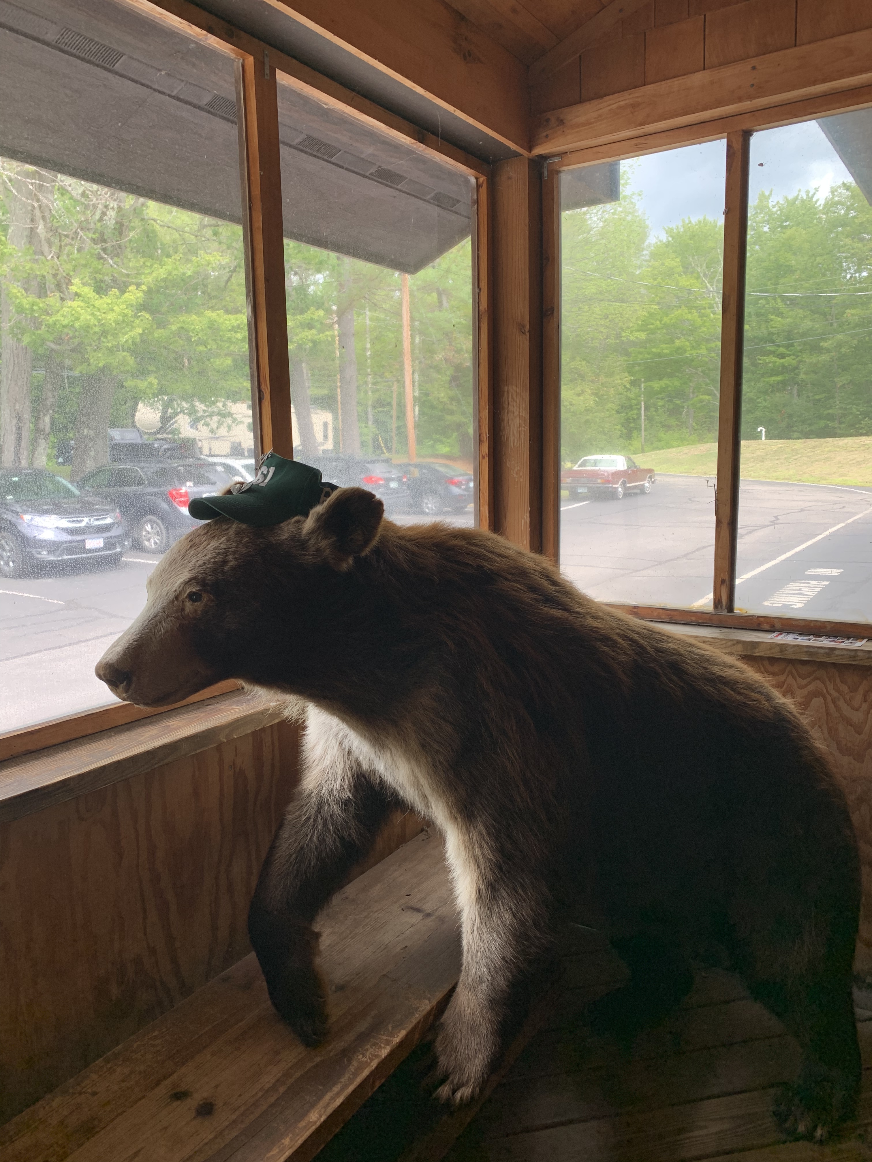 In the morning that we left we stopped off at a restaurant in Meredith to have breakfast. Here are a couple of photos of the bear that inhabited the waiting area and me. Notice how I did not touch it or get too close. It was a little creepy if you ask me but cute.