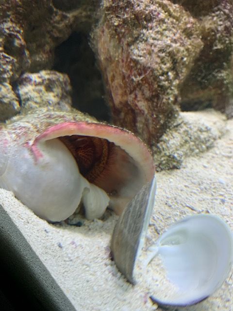 My husband rewarded Sebas Jr. with a clam which he loves. He devours it quickly before the other fish try to steal it from him. He does fight them off with his claws. He ate the clam and is now resting to regain his strength.