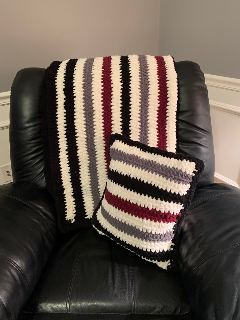These projects were made with a blanket yarn that is soft, warm and sturdy. I have made so many afghans, lapghans and pillows that I’ve lost count! Anyone who has seen them wants one. Yikes! The yarn ranges from $11.99 down to sales at $7.49. I sometimes get lucky and snag the lower prices but as soon as I do they begin to go up again! I buy in quantities and they see me coming!!!