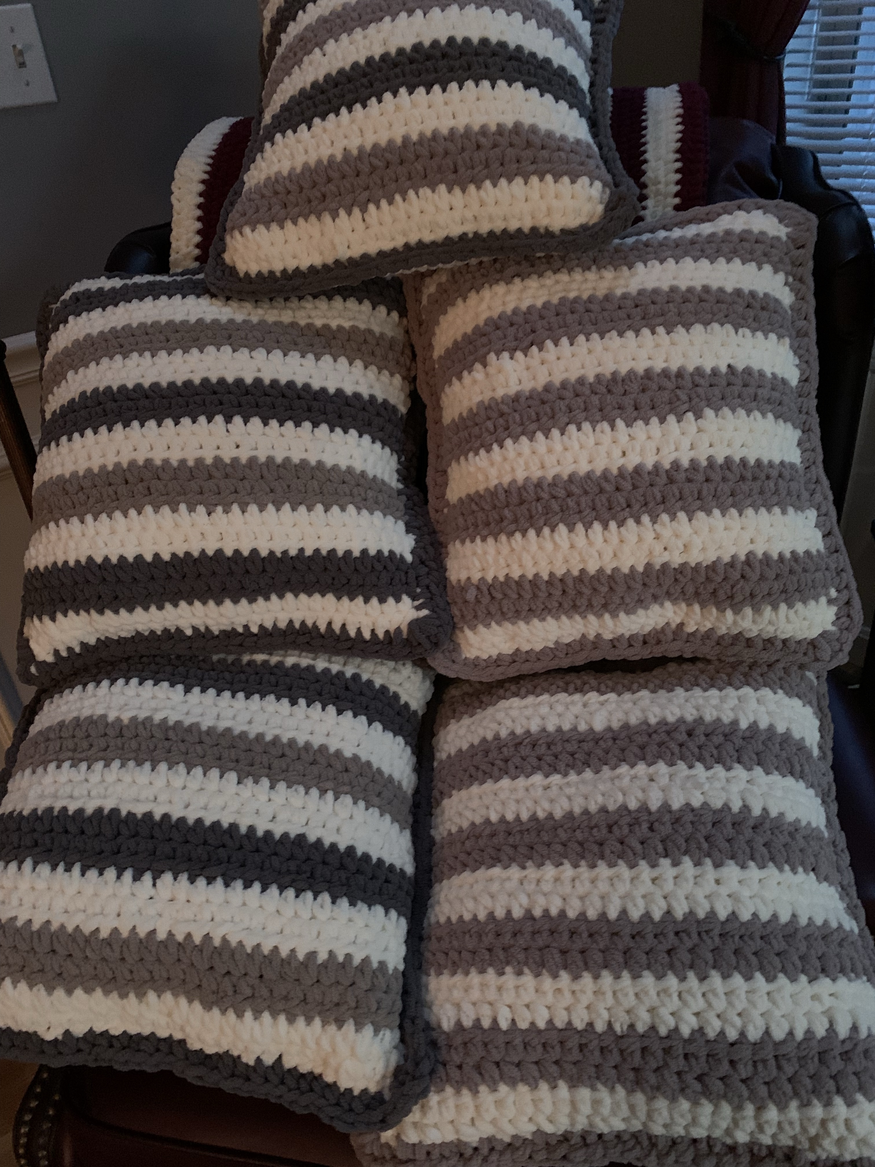 I have crocheted more afghans and pillows than I can count at this writing. Here are all the ones I made for our living room. We are never cold with all these to wrap around us. Many of my family have received a pillow, afghan or both by this time. I plan to work on at least three more before the end of the year.