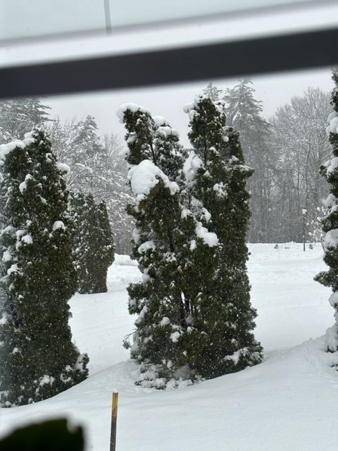 Birds usually hide out in our deciduous evergreens but these trees are completely covered with snow and bending over and separating. Poor birds lost their place to take cover until the snow falls off the trees.