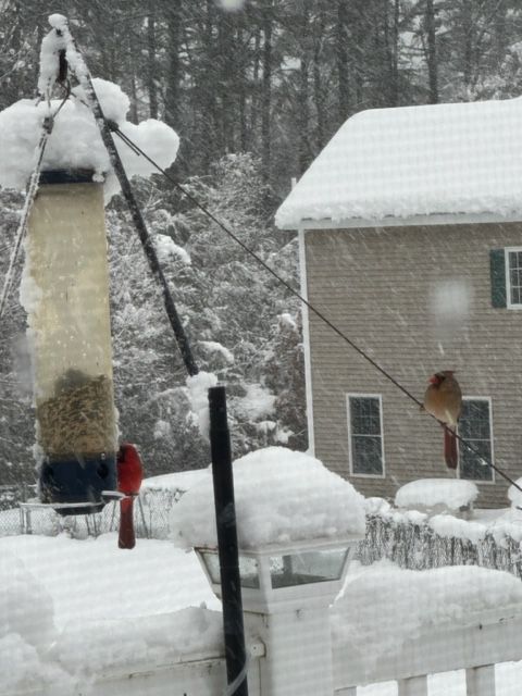 Notice the two photos with the cardinals, one male red and one female red with brown at the feeder. Seeing the brilliant red of the cardinal against the snow takes my breath away!