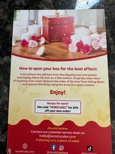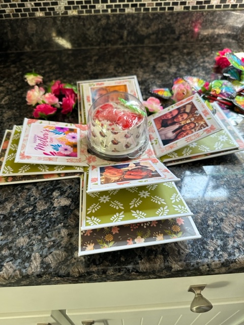 I received a surprise today from my daughter and her family for Mother’s Day. I was away on that day so they waited until I was home to send me this lovely gift. We didn’t capture it on video though, error in forgetting to press the button! Sigh! Here is a photo of it after I opened it. It was such fun to open with all the flowers and butterflies flitting around me and a little cake inside the middle with photos of my family. How lovely!