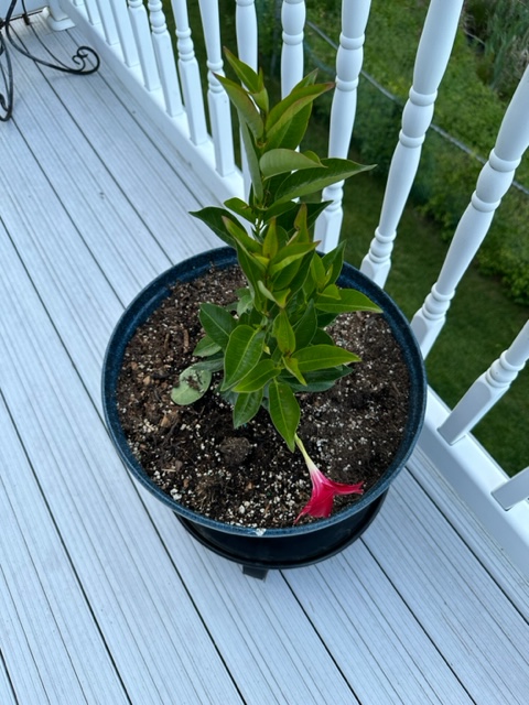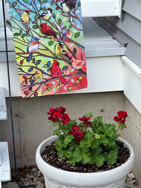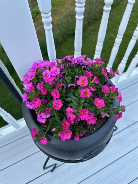 My husband didn’t waste any time purchasing and planting flowers on my rock wall and on our deck. Here are some photos I snapped of all his hard work. Geraniums, basil, Dipladenia, petunias, patio tomatoes and zucchini. I can’t wait until we have some tomatoes and zucchini. I have some great recipes for zucchini on my recipe page. Check them out soon. I will share more of the bounty as it progresses.