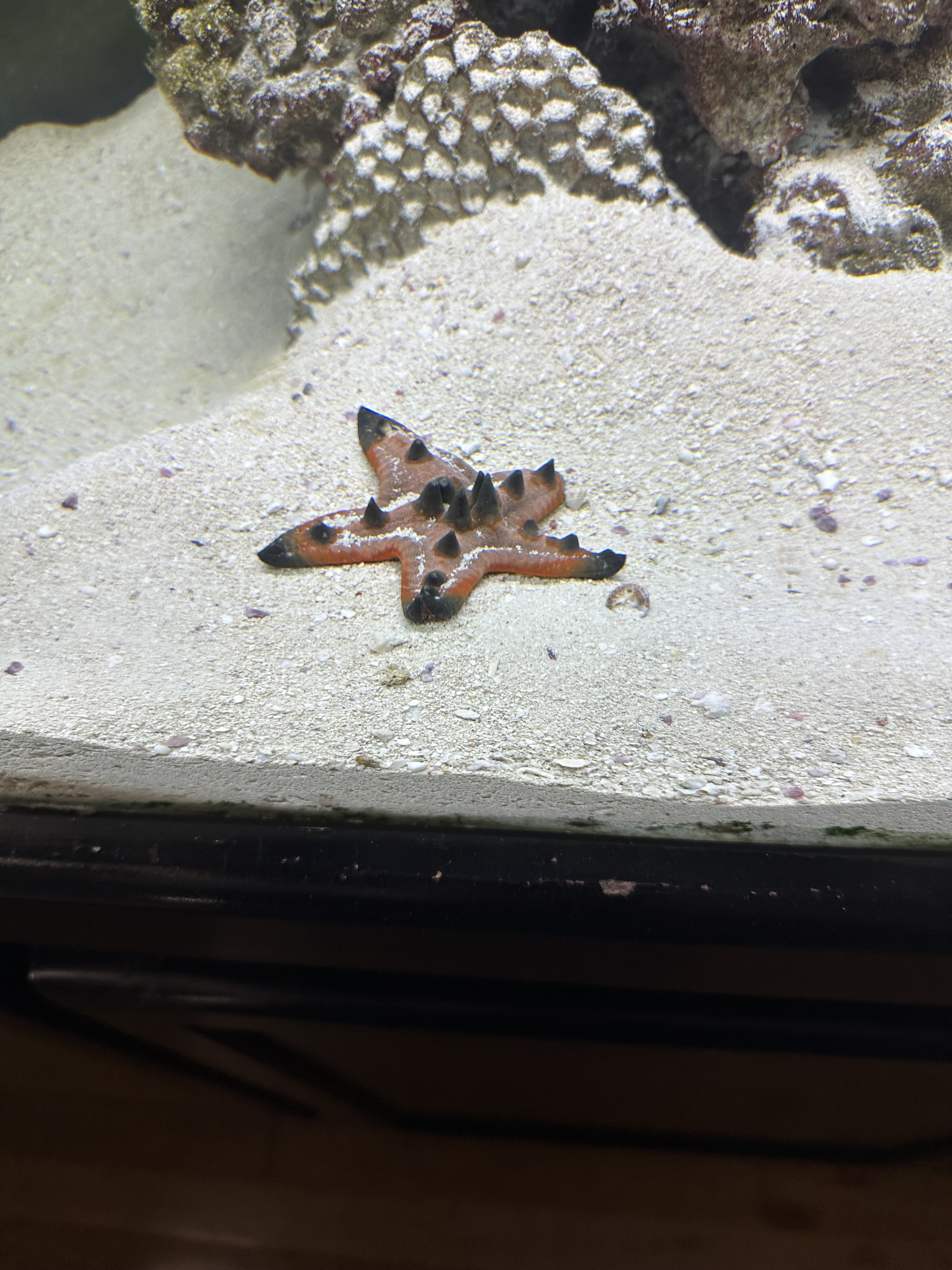 Unfortunately at this writing I have to share that our new chocolate chip starfish did not make it. We don’t know what happened. He seemed to be healthy and eating all the algae on the walls of the tank until suddenly he stopped and slid off the glass to the bottom of the tank.