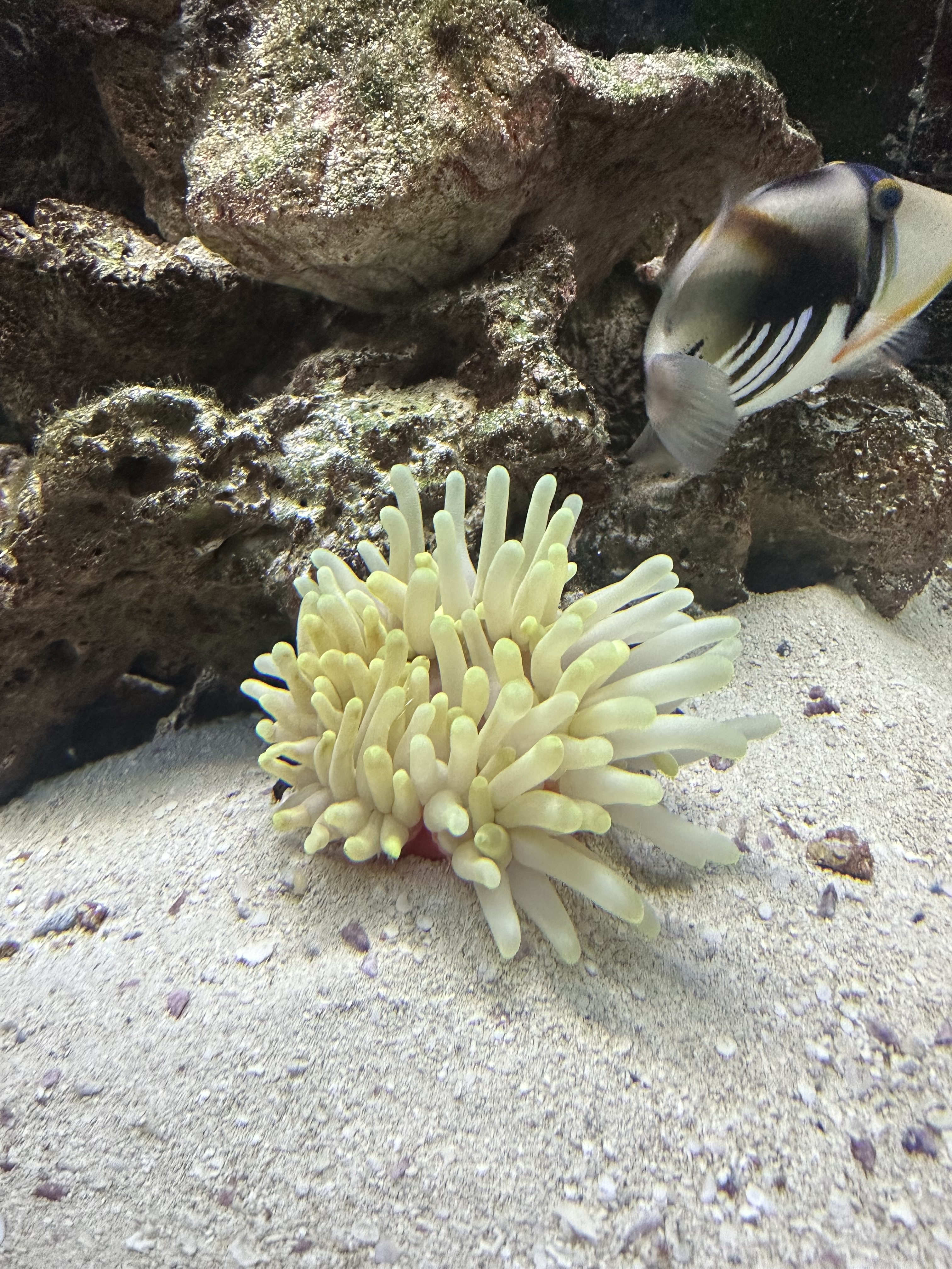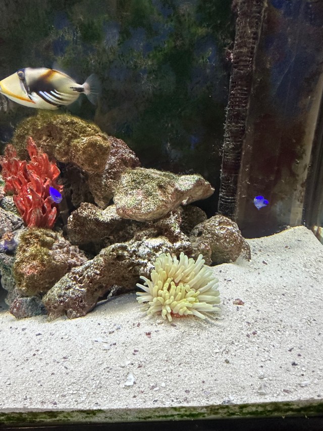 The other fish – trigger, two blue damsels above have been circling the anemone but haven’t disturbed it. Thanks goodness. Still waiting for the clowns to check it out.