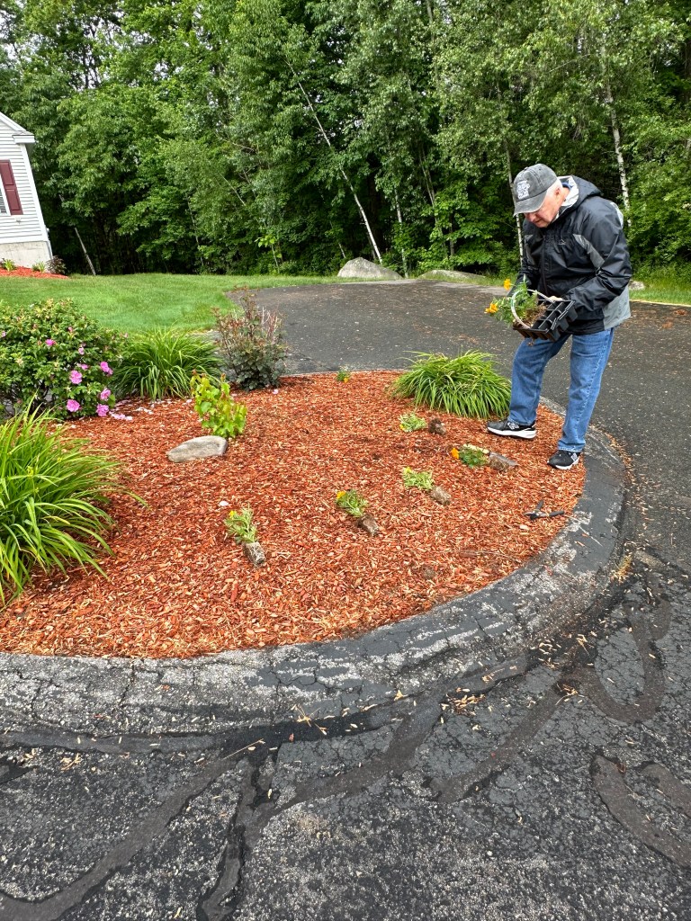 John is planting marigolds in the circle. The rose bush is doing beautifully and actually spreading out and forming new bushes. I never saw that before! I am thrilled! Last fall we planted two little maple trees in the center of the circle from sprouts that we found elsewhere. They have taken root and are growing! Hurray! I look forward to seeing them grow up into one beautiful tree!