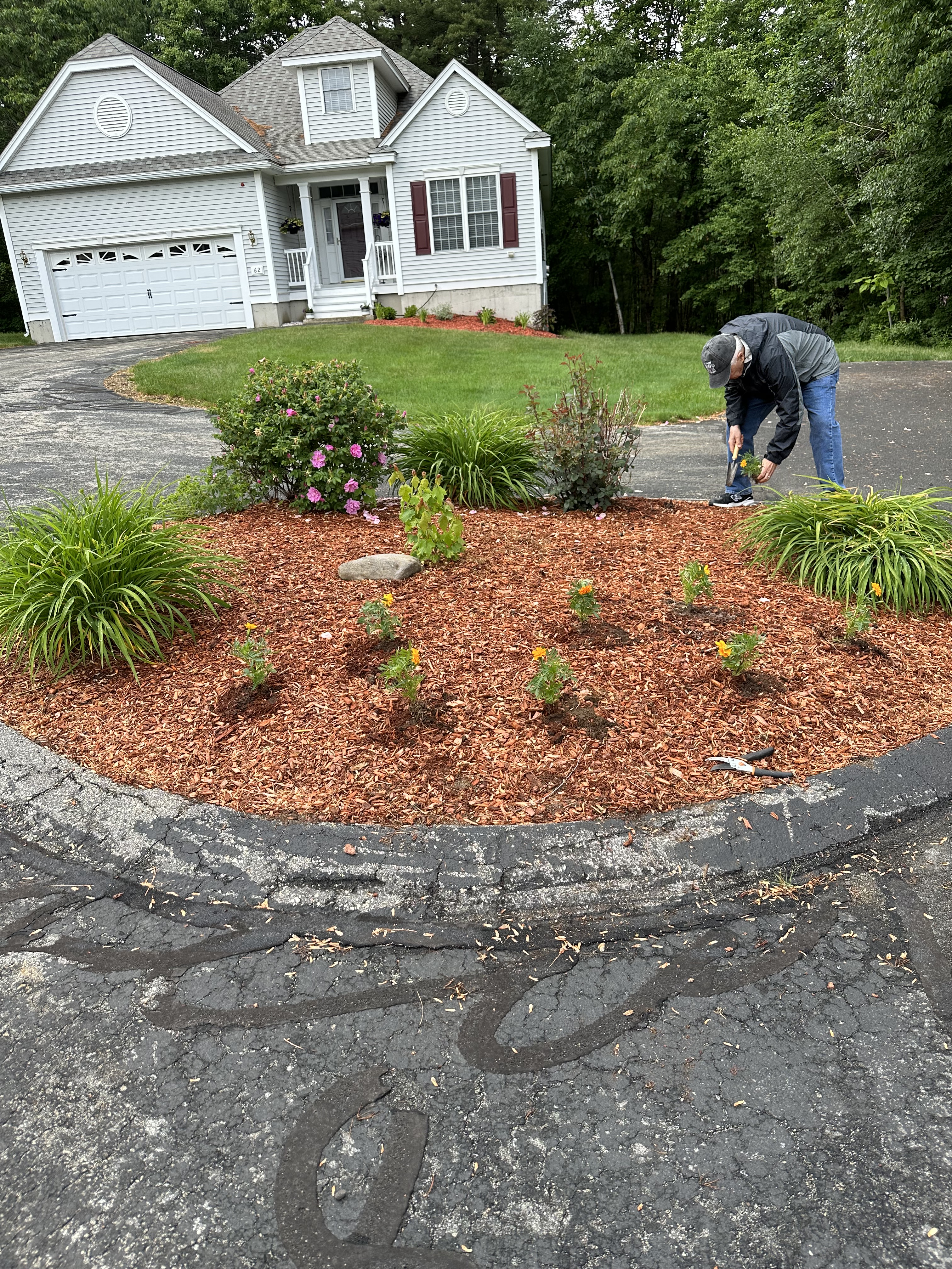John is planting marigolds in the circle. The rose bush is doing beautifully and actually spreading out and forming new bushes. I never saw that before! I am thrilled! Last fall we planted two little maple trees in the center of the circle from sprouts that we found elsewhere. They have taken root and are growing! Hurray! I look forward to seeing them grow up into one beautiful tree!