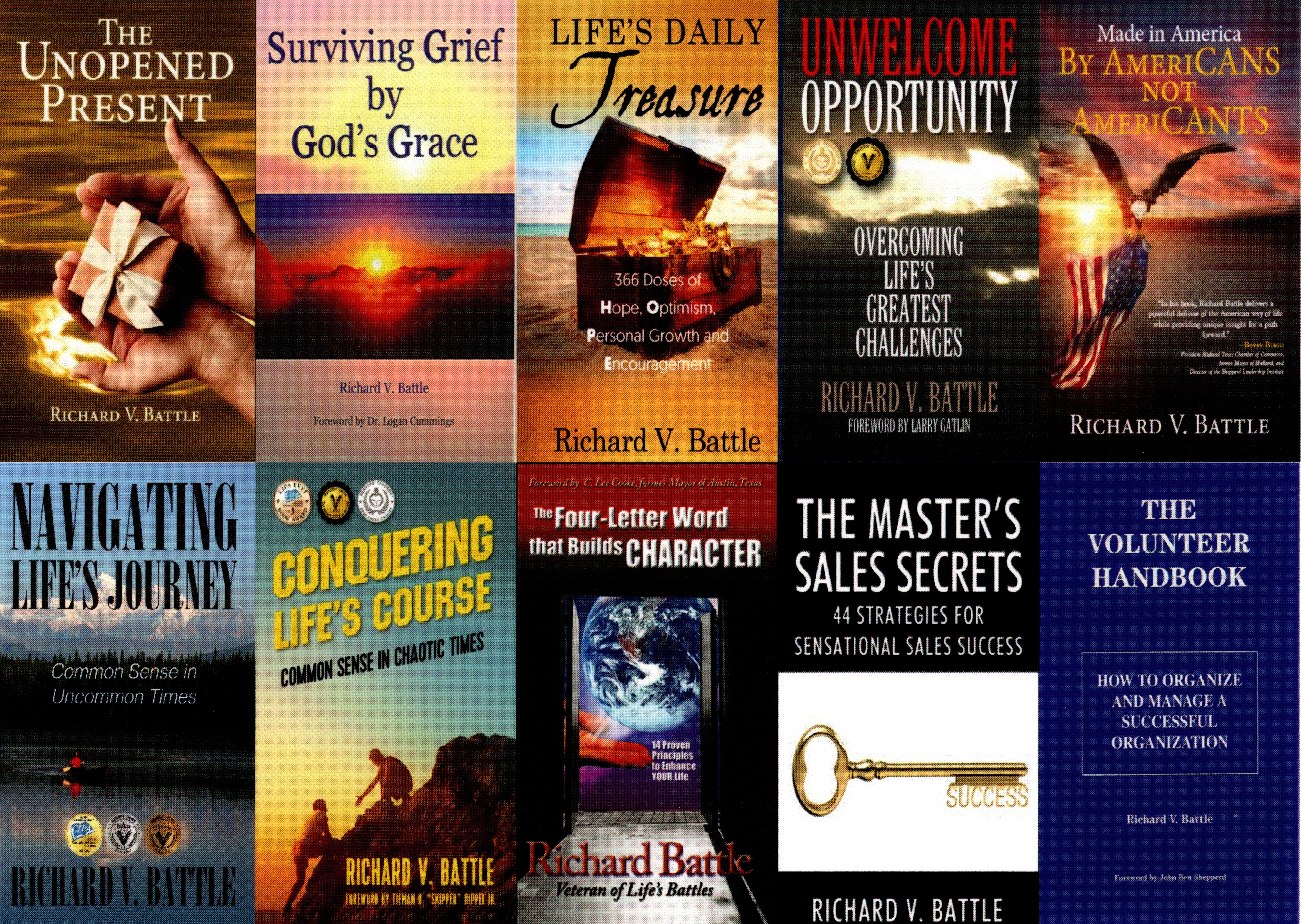 Richard V. Battle’s previous award-winning books include: Made in America by AmeriCANS not AmeriCANTS, Life’s Daily Treasure, Navigating Life’s Journey, Conquering Life’s Course, Unwelcome Opportunity, The Four-Letter Word That Builds Character, The Master’s Sales Secrets, Surviving Grief by God’s Grace and The Volunteer Handbook – How to Organize and Manage a Successful Organization.