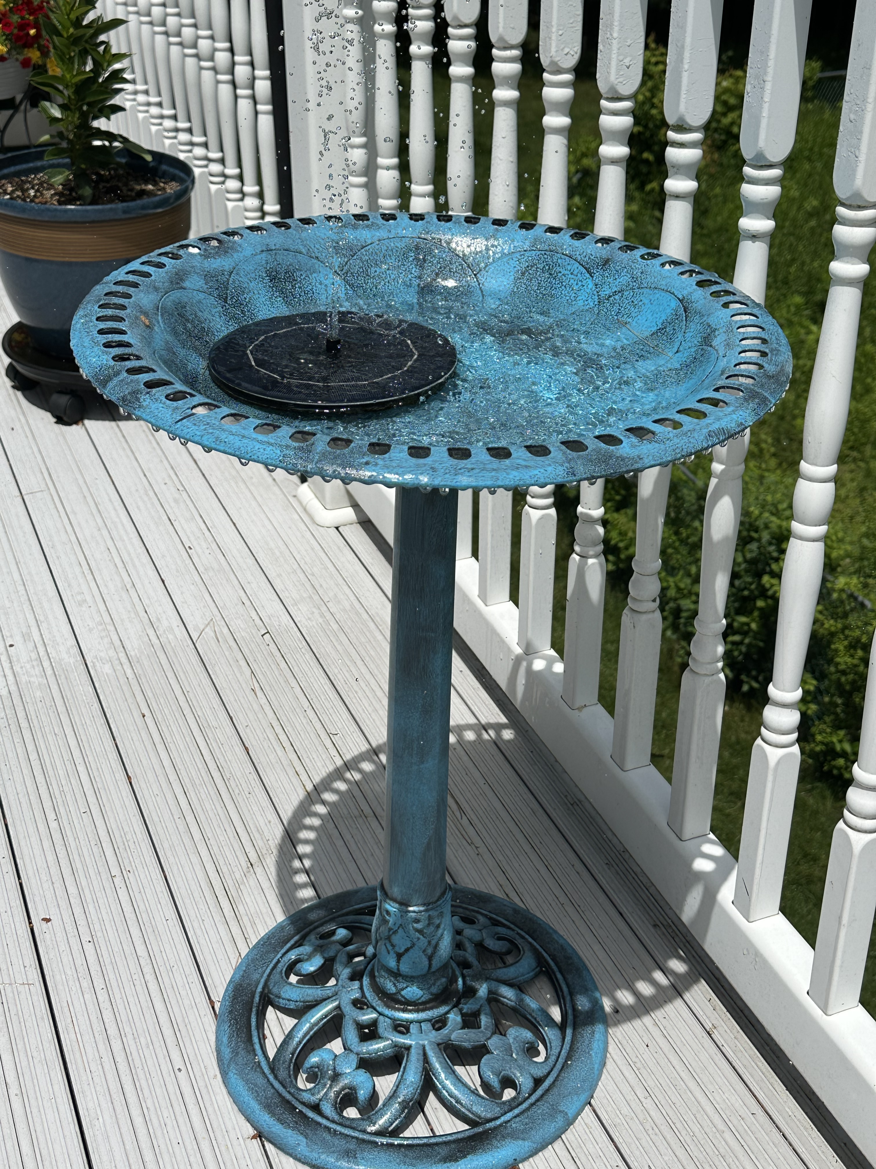 These are photos of the damage it caused. The first one is of a cap to our porch railing that my husband did manage to fix. The second photo is of our completely demolished birdbath. We heard a horrific crash in the middle of the night when the raccoon did this. We didn’t see the animal but figured it was the same one that has been paying us a visit before leaving his paw prints on the stairs and railings. He was evidently trying to reach the bird feeders but was, thank goodness, unsuccessful. The crash must have frightened him half to death too. But he did come back and damage the light cap a couple of days later in a second attempt to eat. We have since replaced the damaged birdbath with a metal one, see photo below.