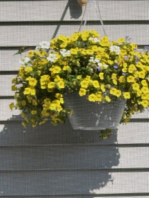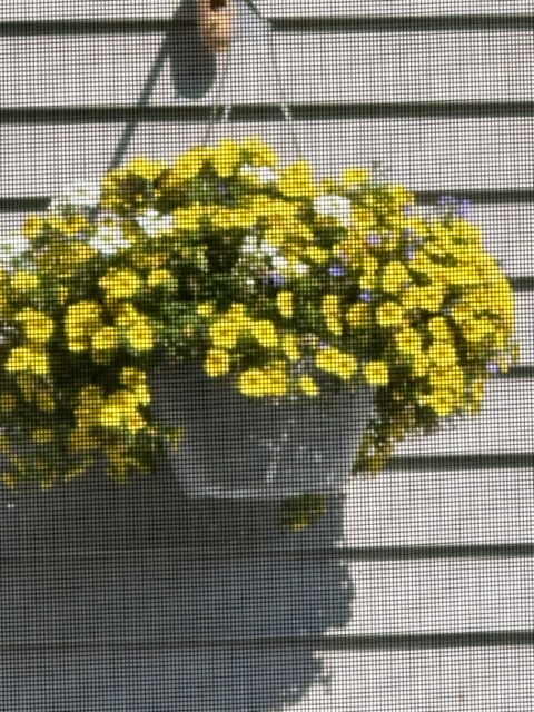 Here are the petunias on the hanging planter with hummingbirds feeding off of the flowers. I took this through our screen door since I could not go out or I would have frightened the bird away. Sigh!