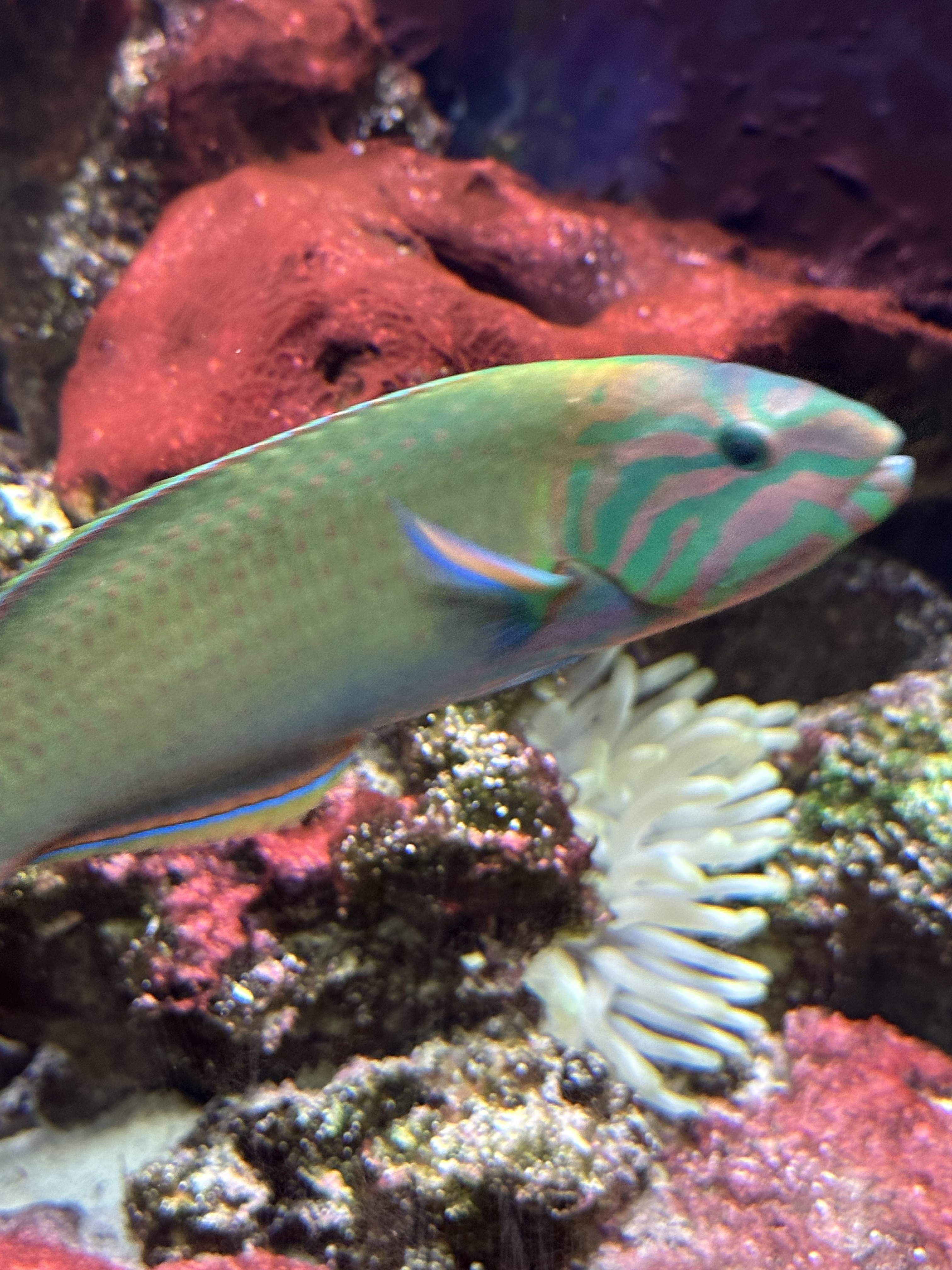 Our fish do have their own personalities. Trigger is like a tiger, possessive of his cave in the center of the tank where he recently got stuck when John had to take the cave out to clean it of algae. John had to poke Trigger out with a stick. He finally came out. We thought that Trigger would not want to go back in the cave after that harrowing experience of being stuck, but he was right back in to claim it when John return the cleaned cave to its rightful place in the tank. Wrasse tried to take it over but was chased away by an irate Trigger. Ha!