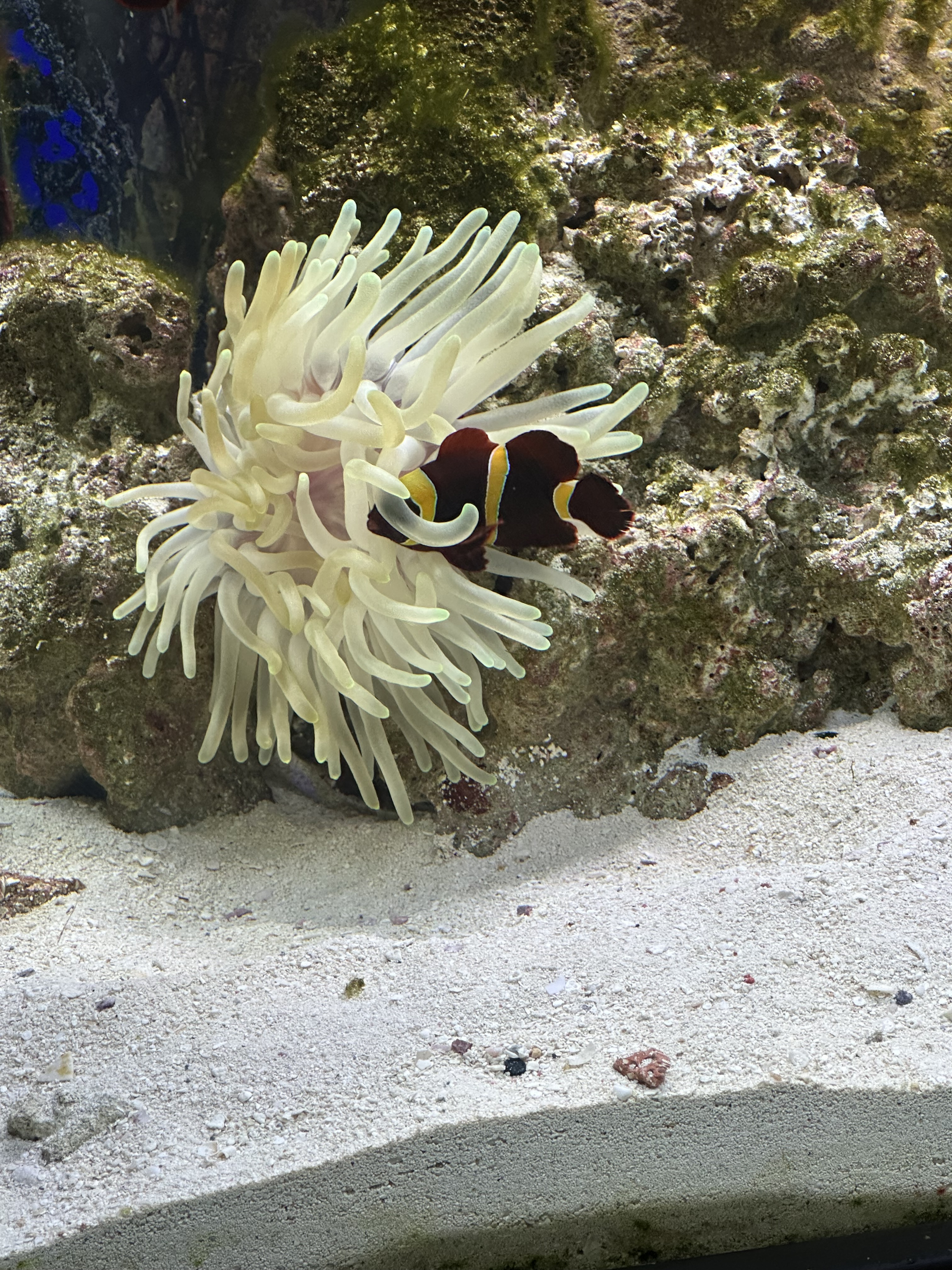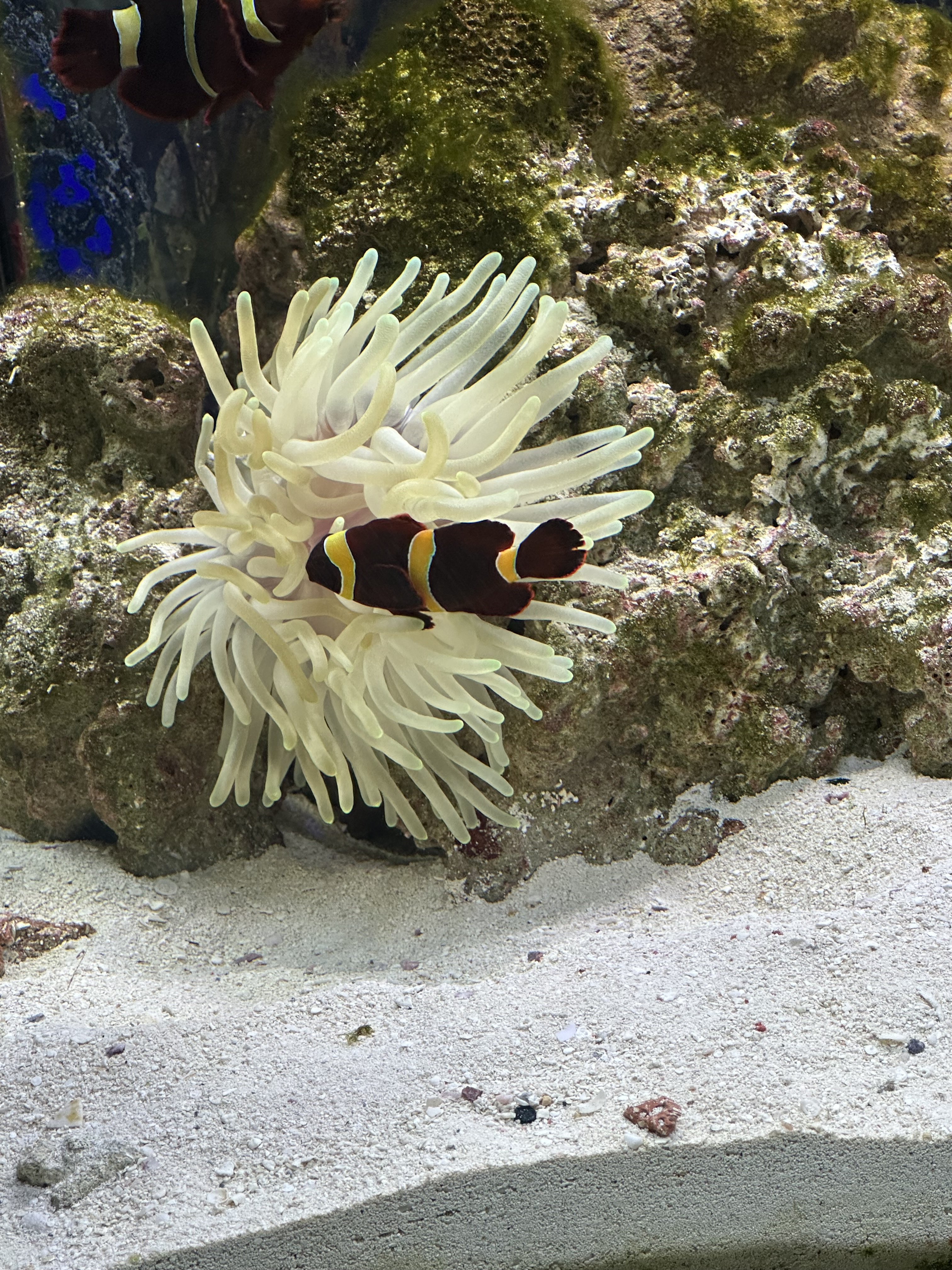 I am excited about what is happening in our saltwater tank! Our anemone is happy too! One of clown fish (smaller one) has decided finally to host the anemone! Hurray! This is a good thing for the anemone and also for the clown fish. They will both benefit from this hosting.