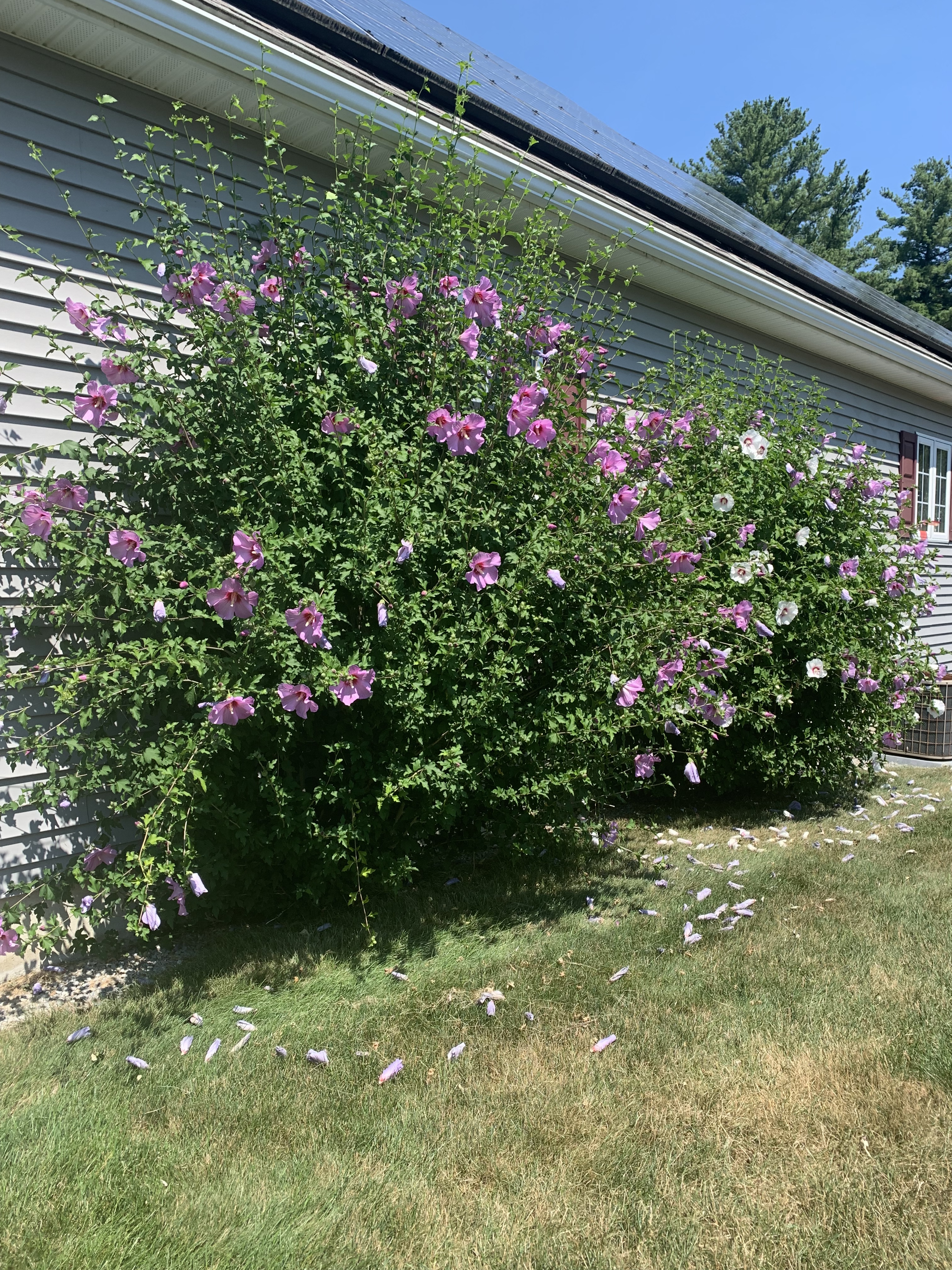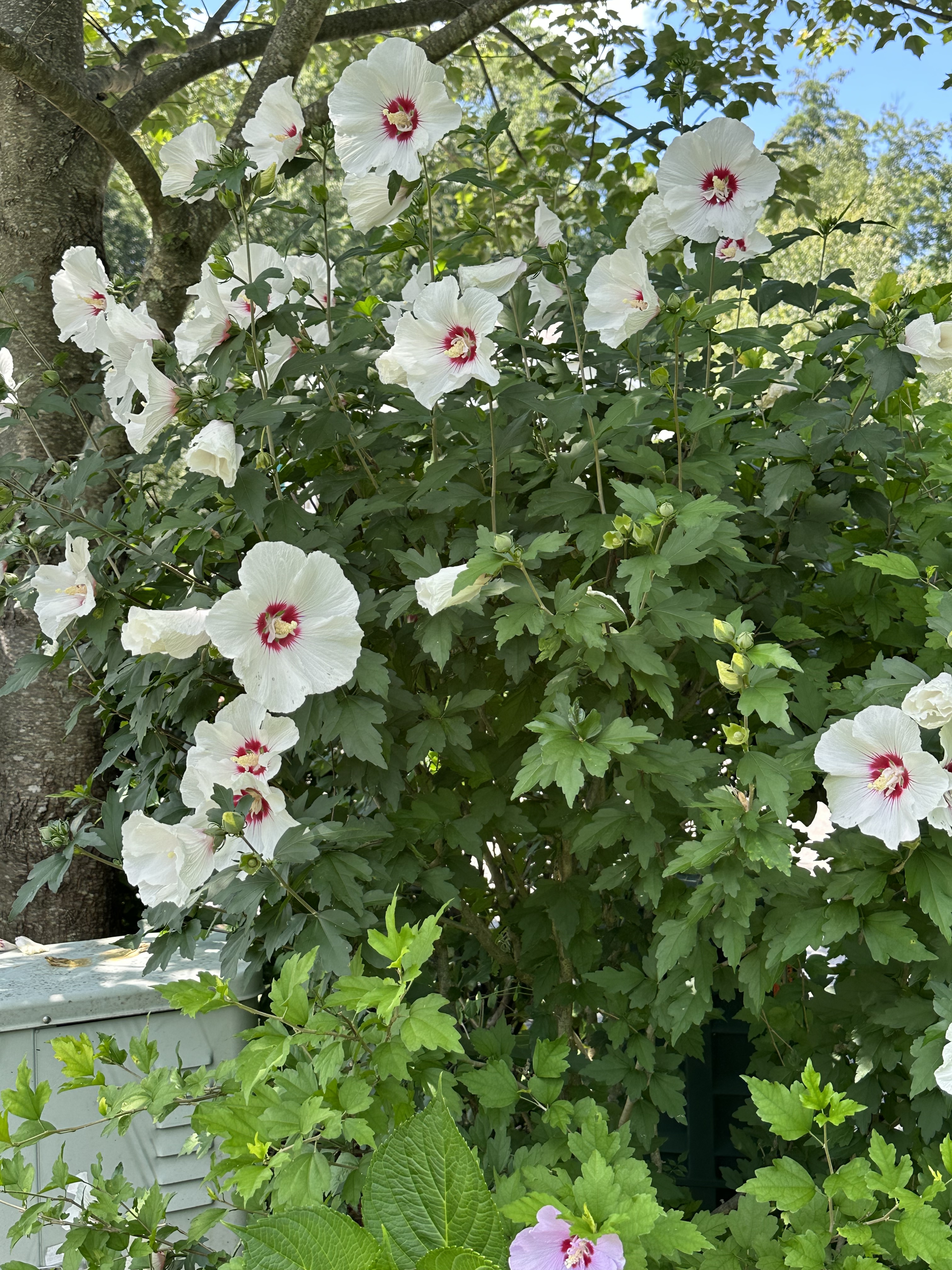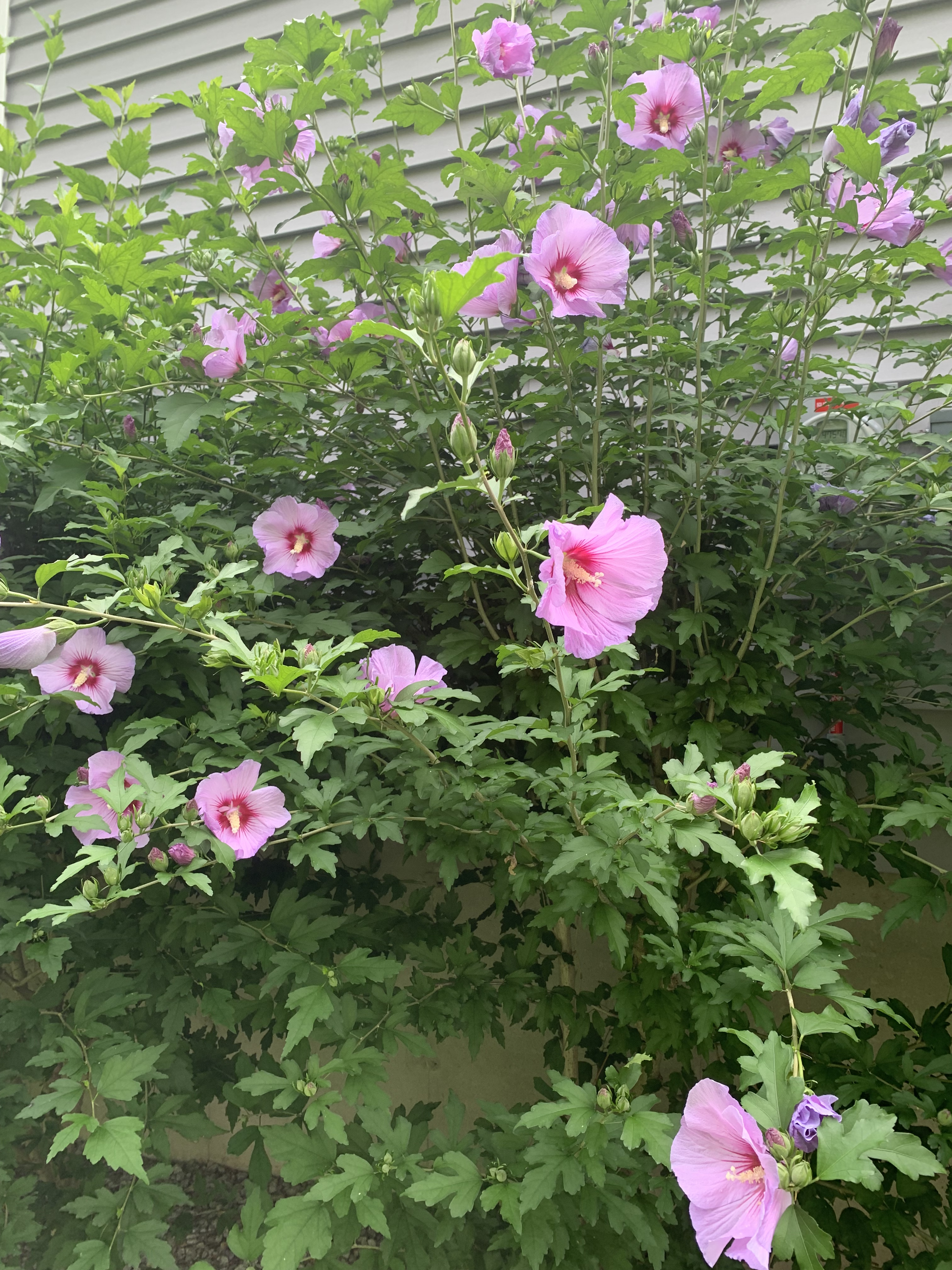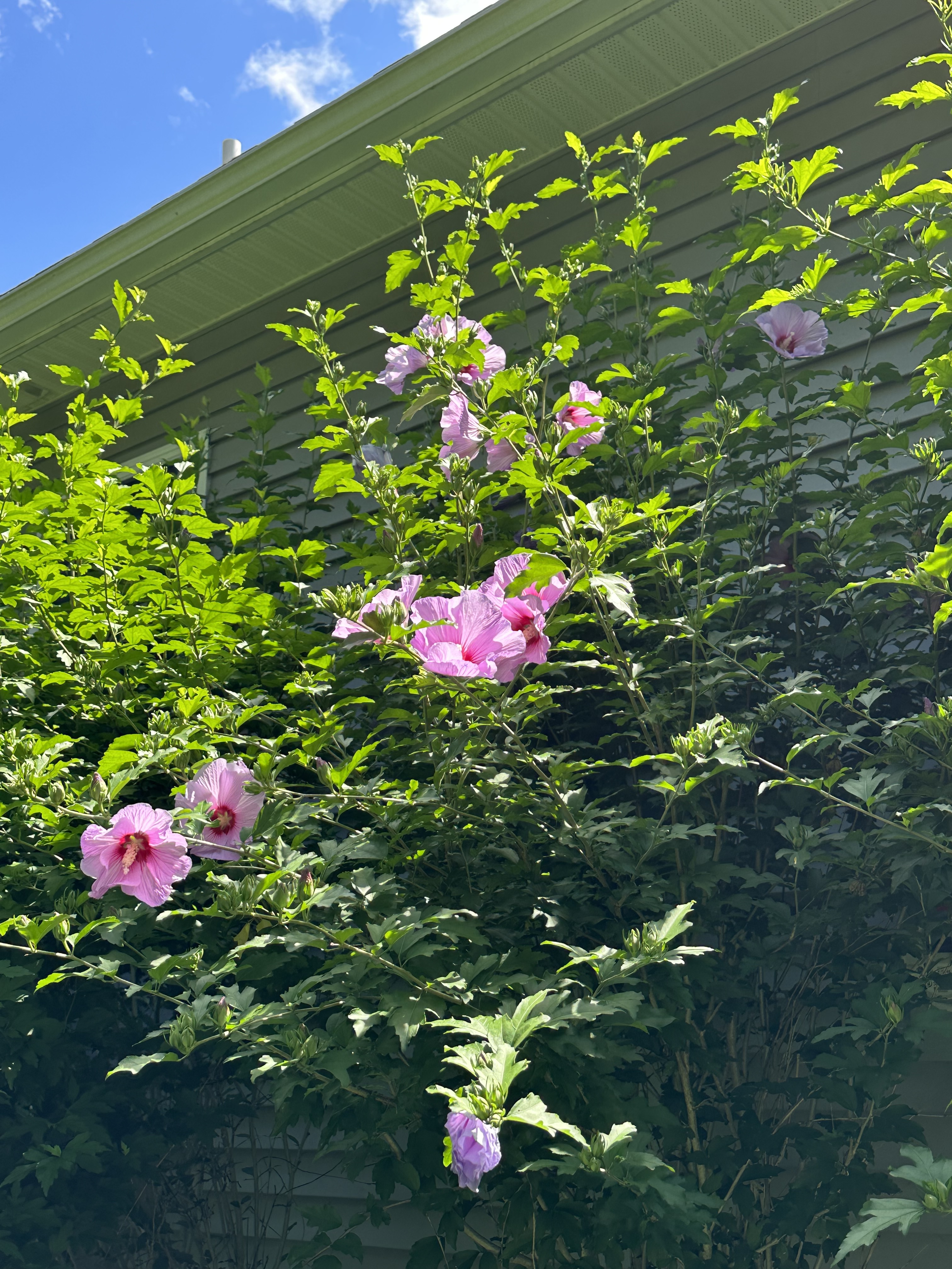 The following photos are of 2022, 2021 and 2020 Rose of Sharon bushes which were flowering profusely around the same time in these months as this year. The weather in past summers was much sunnier and not as rainy. Though our flowers need the rain they also need the sun as we do!