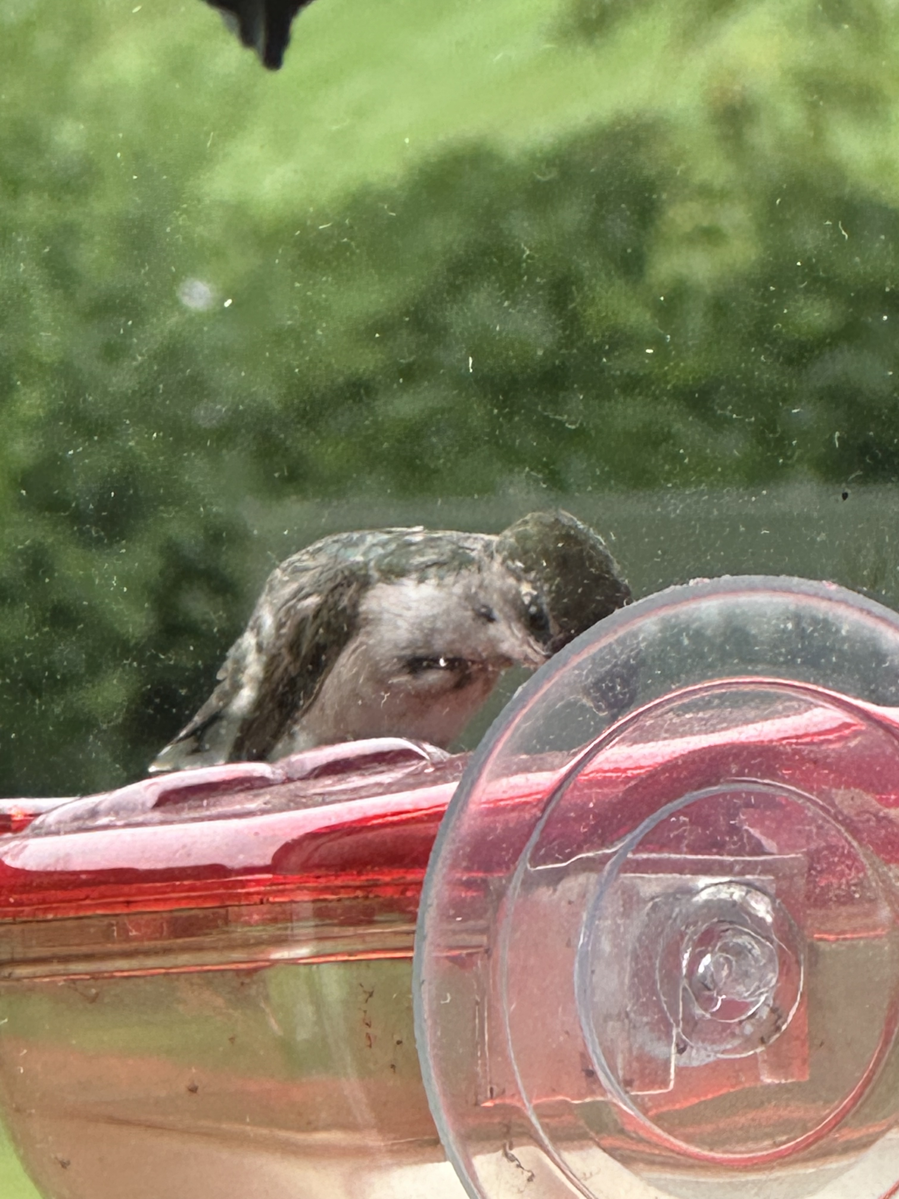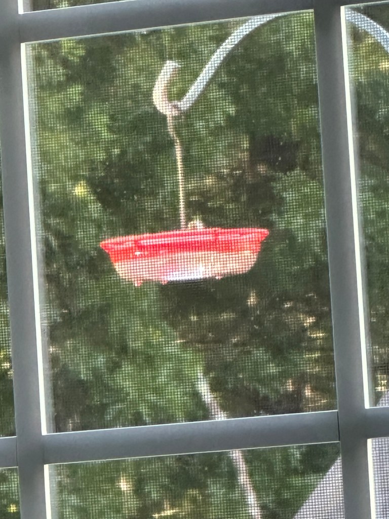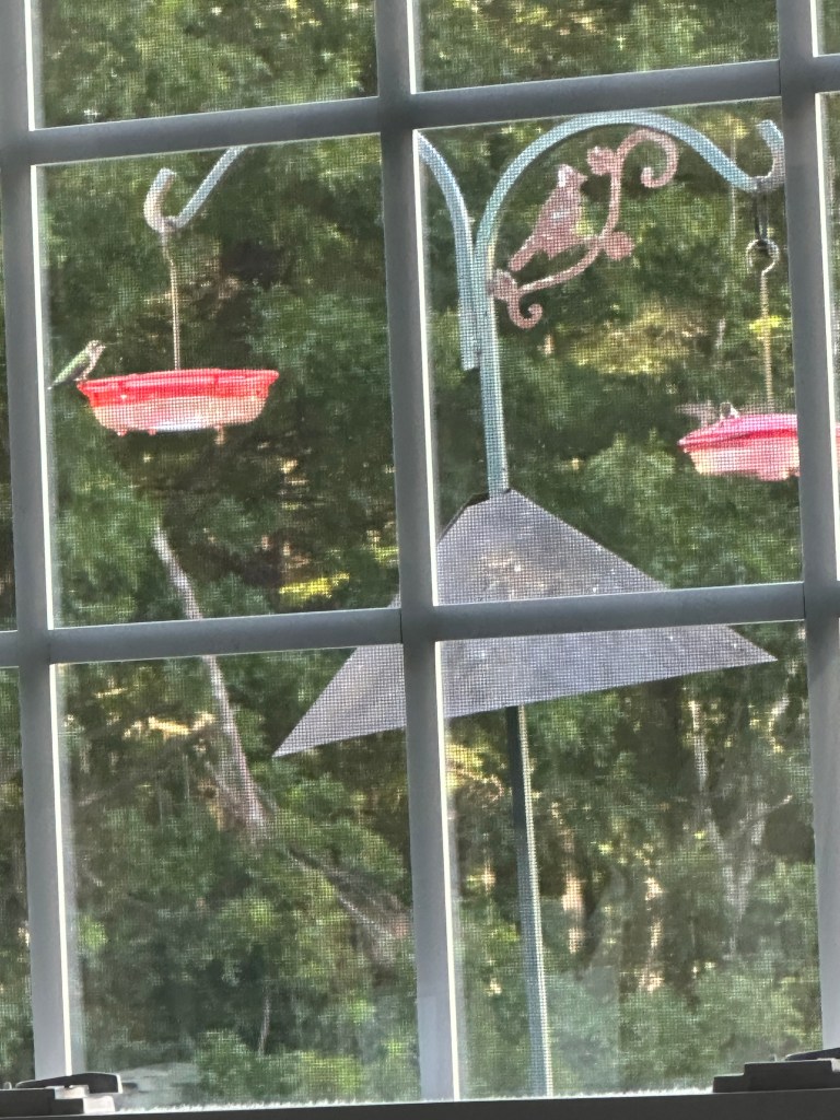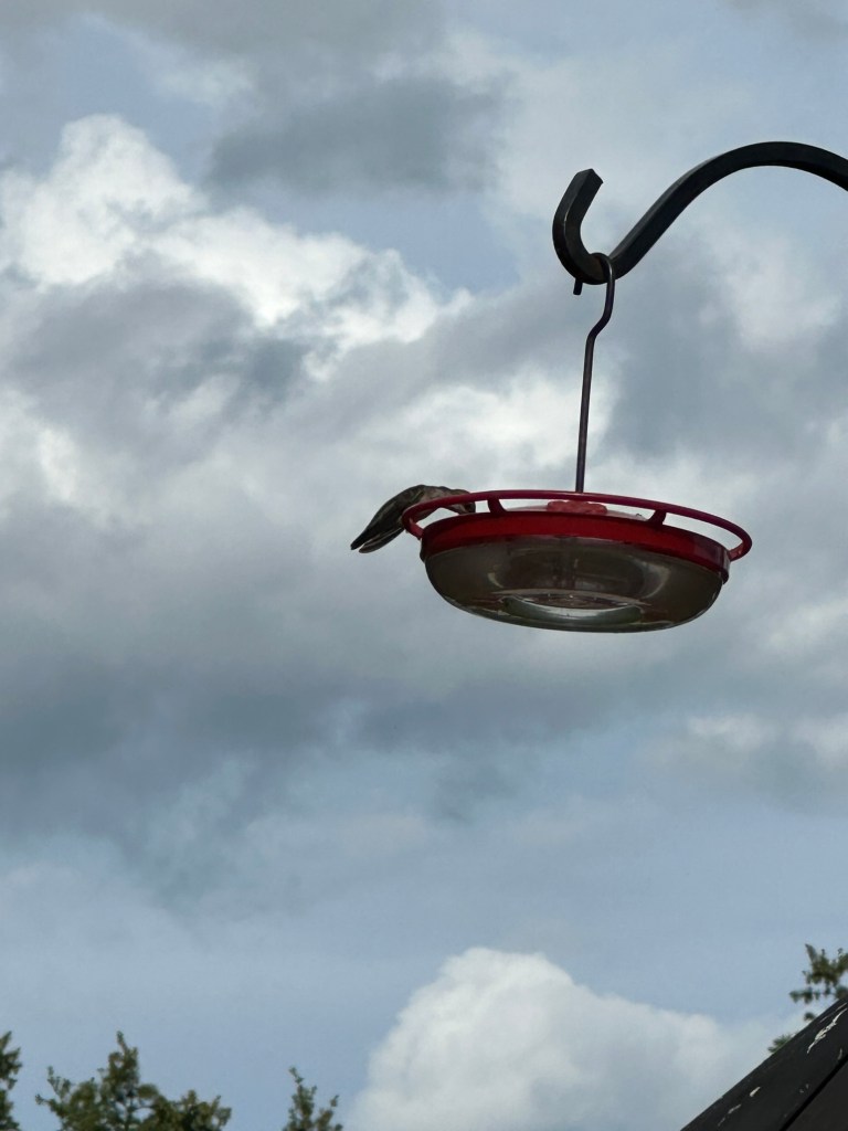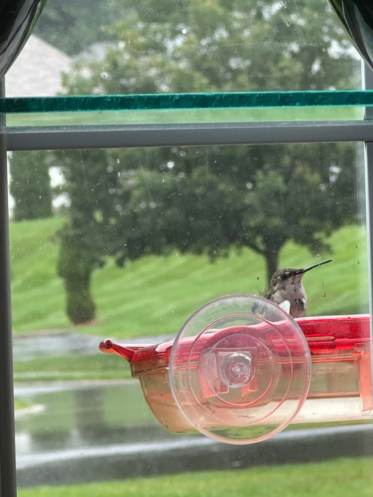This little fellow stayed here a long time as I tried to keep my distance while filming this video. He did keep looking up at me, not sure of what danger I could be to him. Each of these photos were of a different bird. They do all look similar though. I didn’t see an emerald or ruby throated one at this feeder but they were at the other three on our back deck. This little feeder is on my kitchen window over the sink. It is a joy to see them as I wash dishes each day, but soon they will be gone. It is a sure sign when they come so often and stay a long time to drink in this precious liquid to store energy for their long trip.