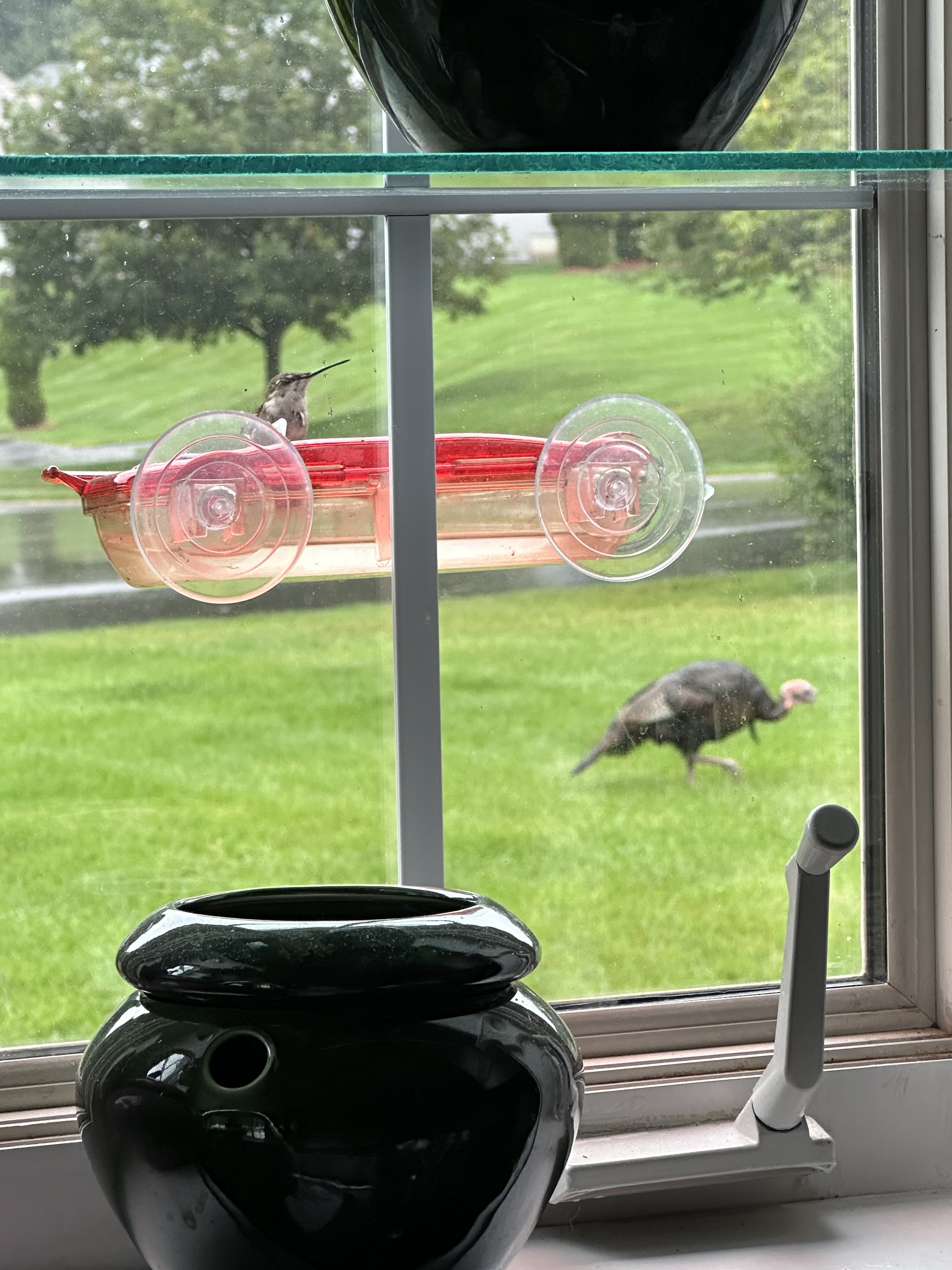 It’s so sad to say that the beautiful and incredible hummingbirds that we see each day lately are getting ready to leave on their long trek south. They are seen often tanking up at all of our feeders. I have captured a few photos and a video to share with you. In the third photo I captured another visitor in the background – a turkey.