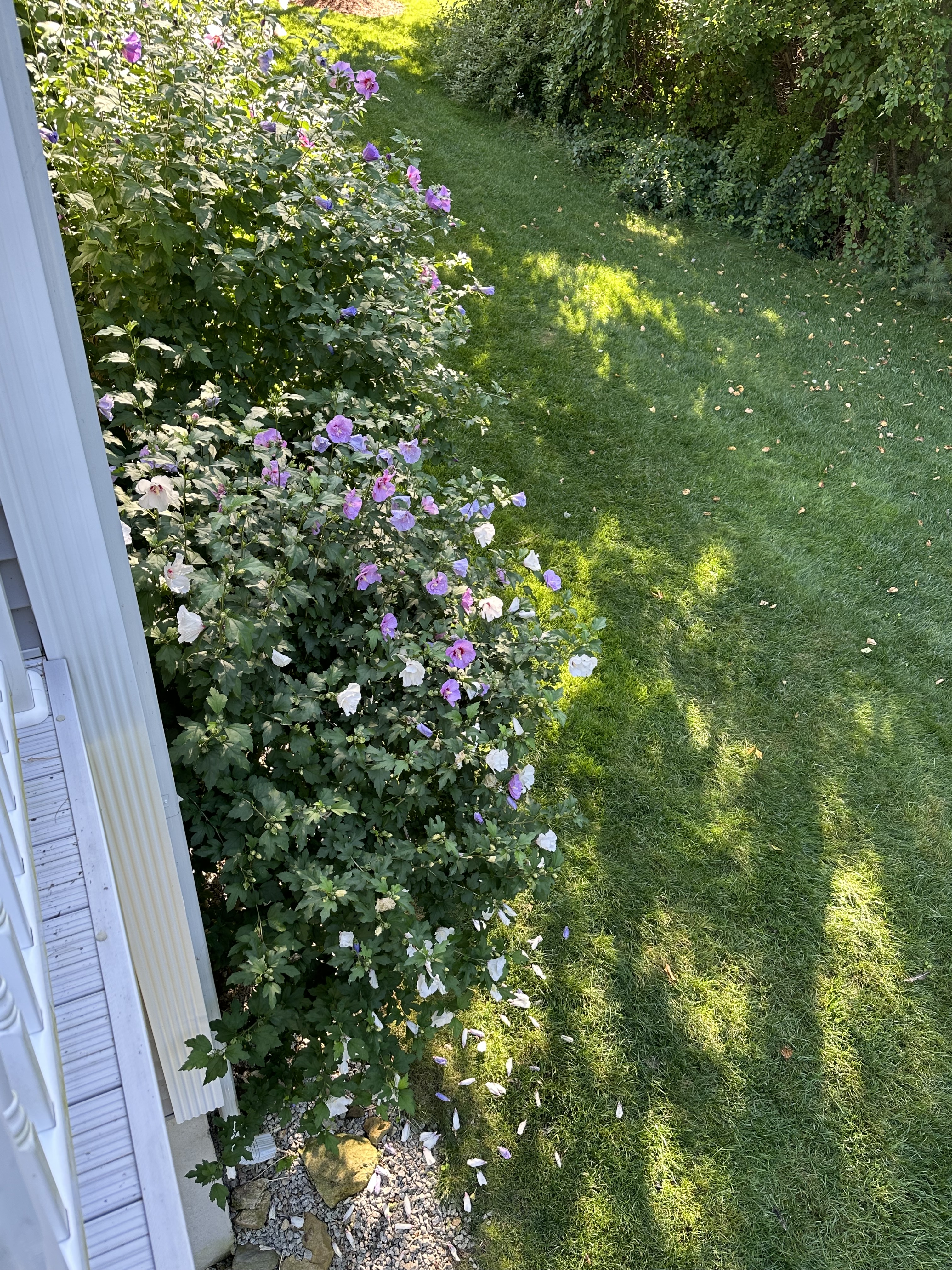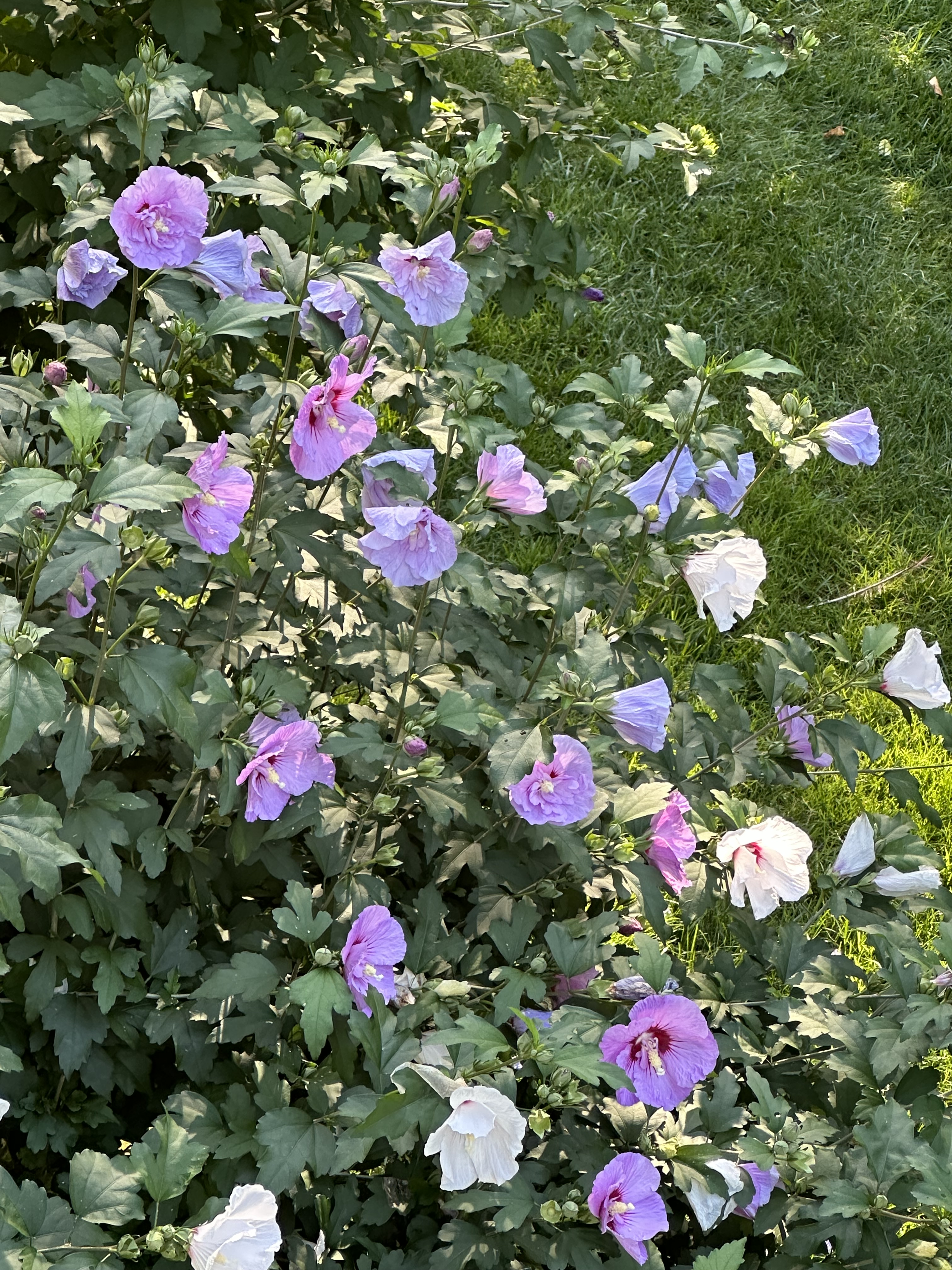 I love sharing my flowers on the deck and in and around our yard. The Rose of Sharon bushes are doing beautifully! They were late starting because of all the rain we had in June and July but now they are showing off their blossoms in grand style. The flowers are in white and shades of pink, violet and brighter pink. Our neighbors rave about them and enjoy them during August until the last blossom falls from the bushes.
