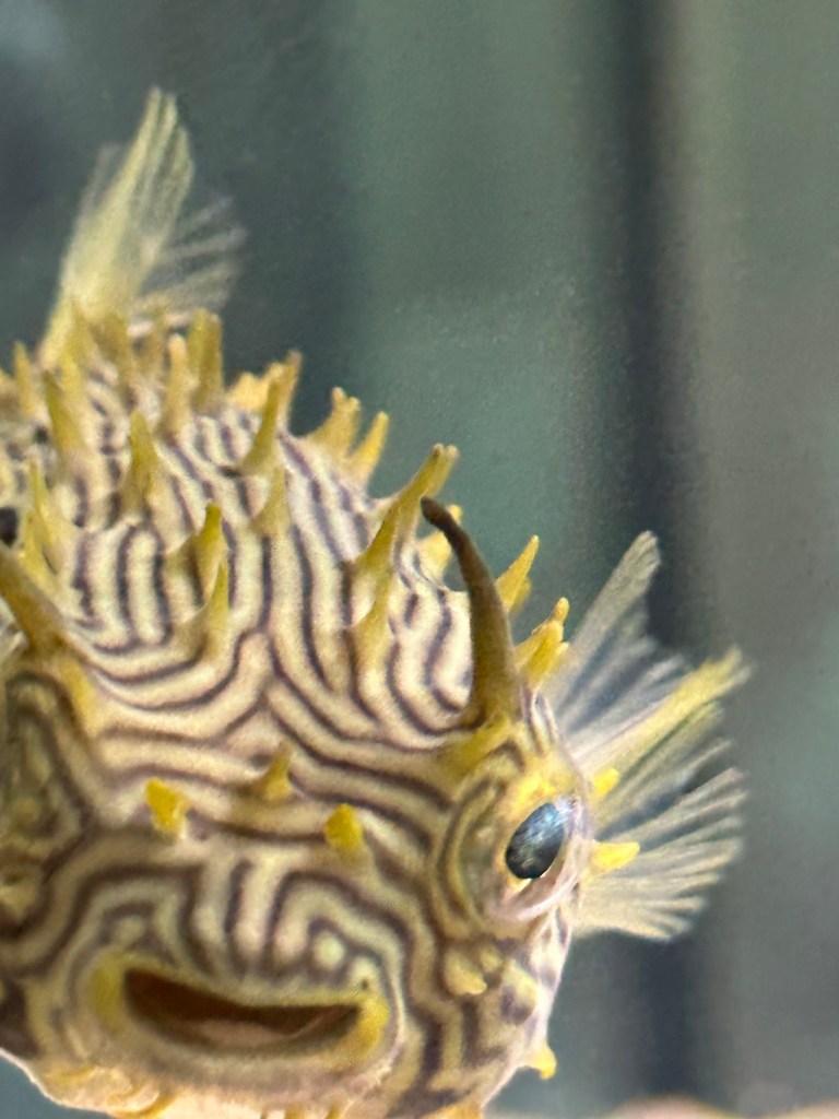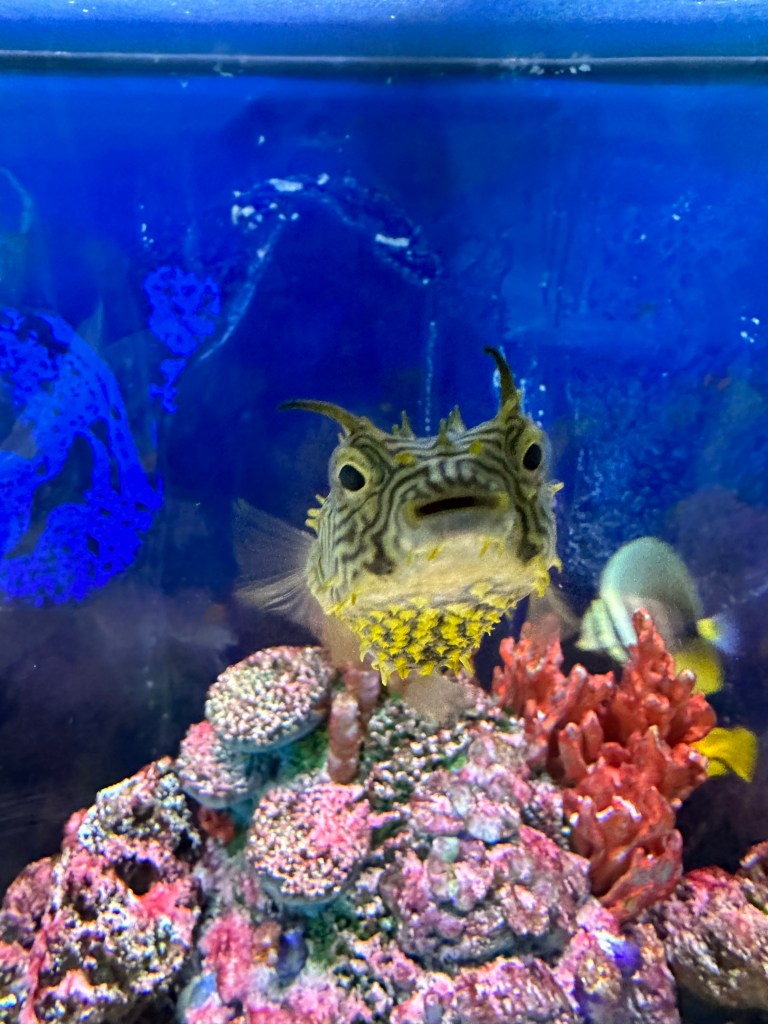 I have been enjoying watching our new spiny puffer burrfish – Raymond Burrfish! He is quite entertaining! I think he knows me now and follows me around as I passed by his tank many times a day to say ‘hello.’