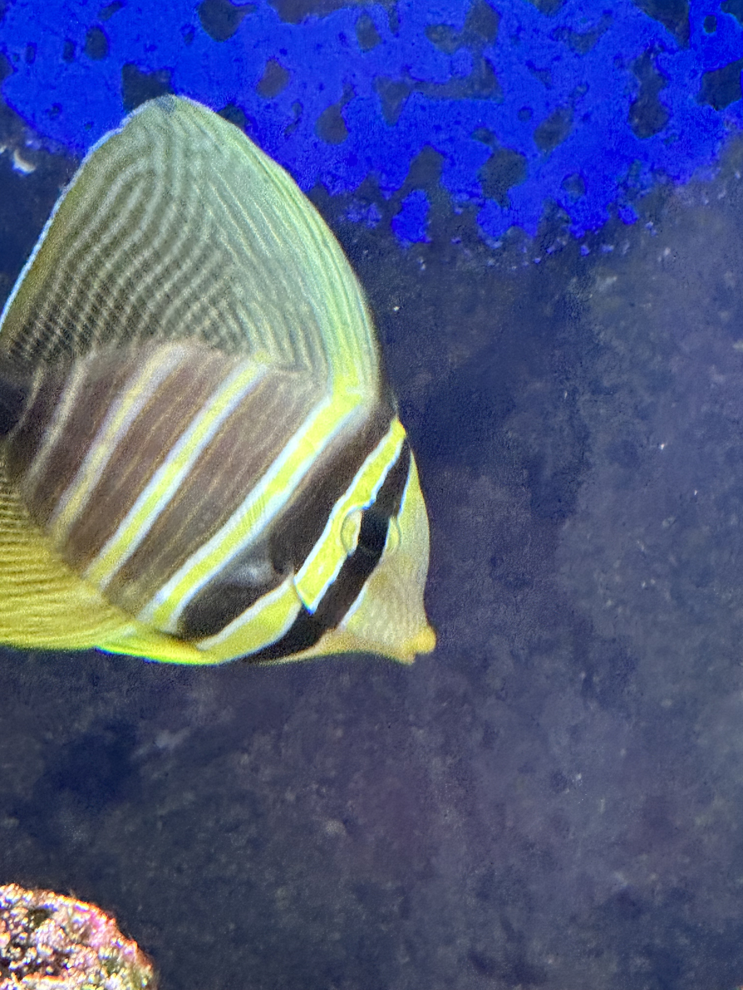 Ray comes right up to the glass and looks at me as you can see in these photos. I think he wants me to feed him since I keep stopping by. He is ravenously hungry now that he has fully acclimated to his new home. At first he didn’t eat very much and most of the food was taken away from him by the aggressive Trigger fish. He is such a bully! There is one in every tank!