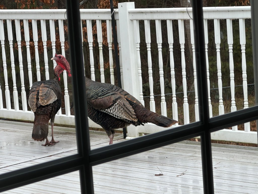 As I have mentioned in previous posts we have many visitors to our yard and neighborhood. The most frequent visitors are the myriad turkeys who come daily. They appear to be multiplying in front of our eyes. I don’t know if that is a good thing.