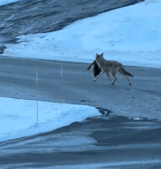 A coyote escaping with a turkey!