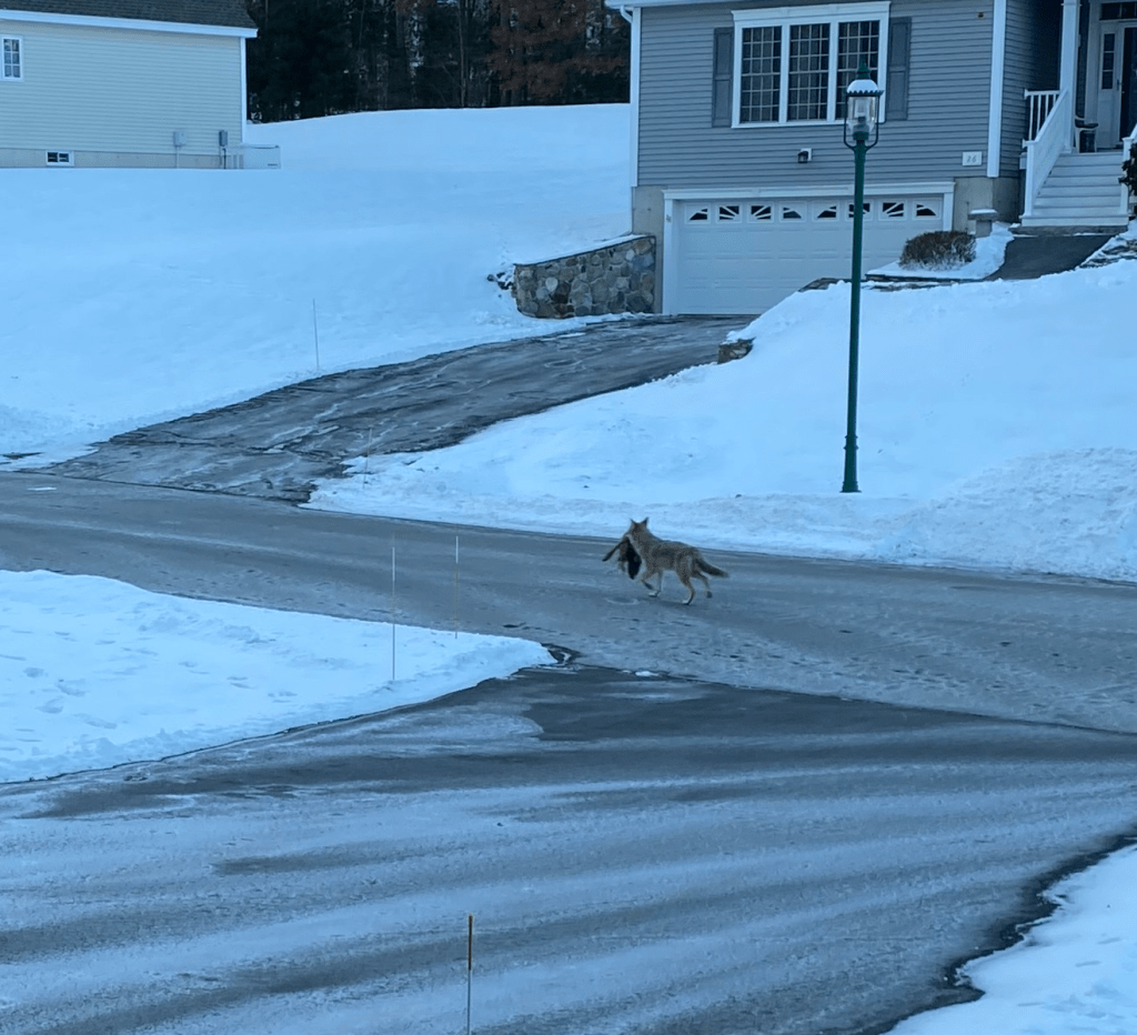 Turkeys are huge birds up close and not too personal that fly up into the trees to roost at night. They disappear into the trees once they are there. They need to stay up and away from these coyotes who will return for another meal. We also have fox and Fisher cats who would also love to feast on these birds.