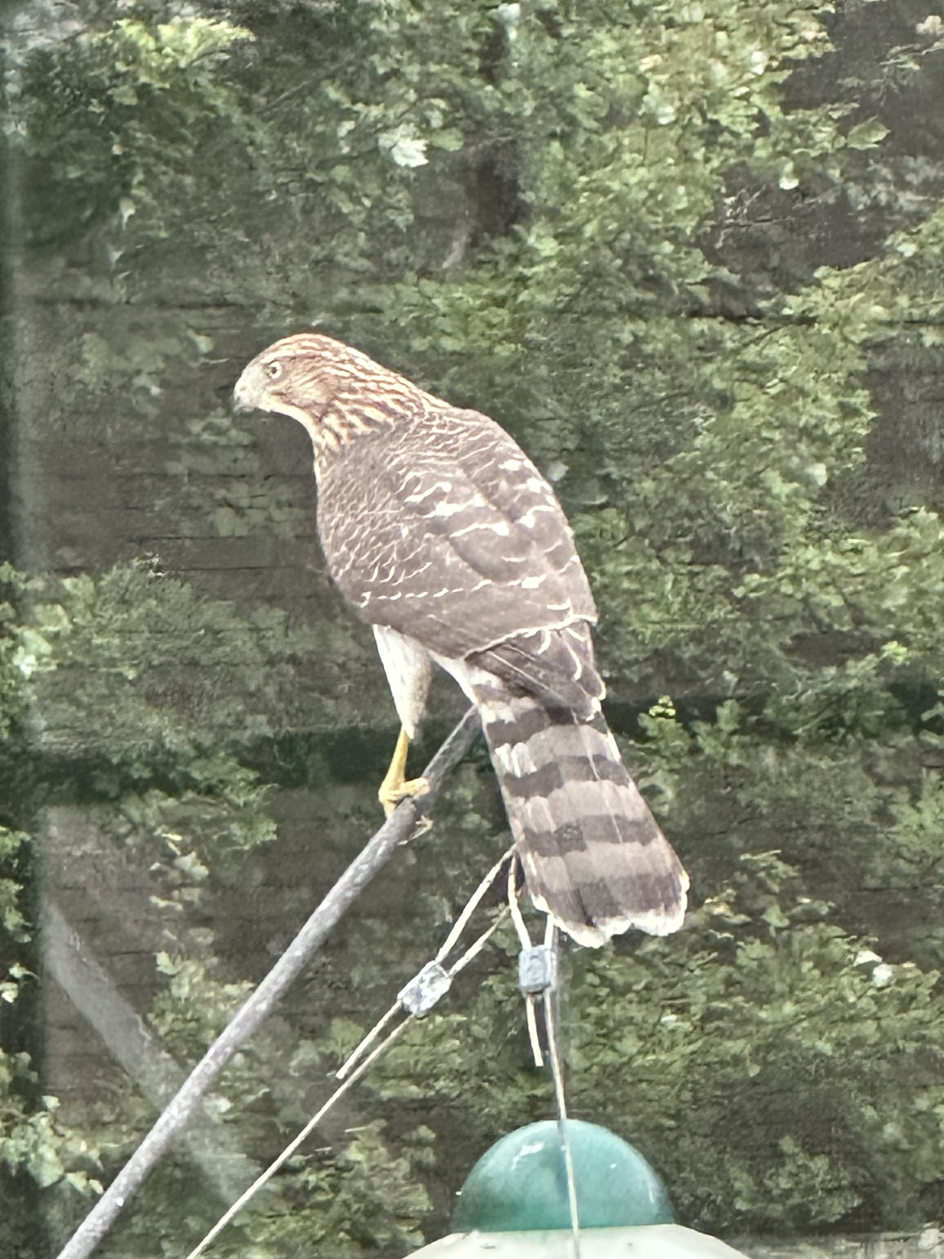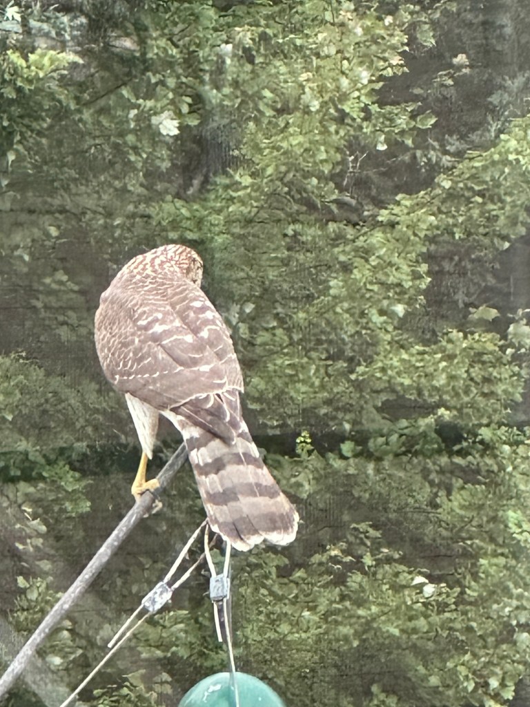 We had a surprise visitor to our back deck today at dinner time. We were enjoying watching the birds avidly eating at the feeders we have. Suddenly John saw a large bird fly by our window causing all the birds to take cover. Unfortunately, I think one did not get away.