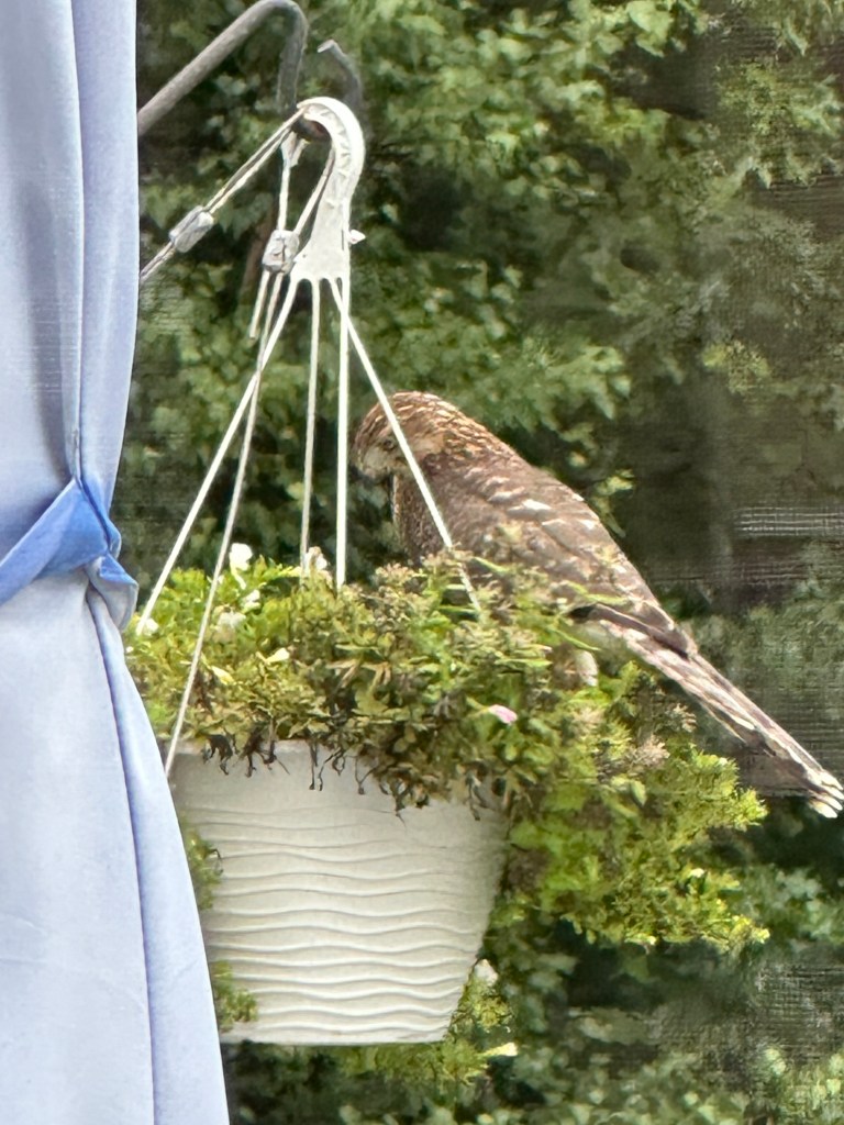 This awesome hawk appeared on our deck moments later. Here are a few photos I snapped. In one of them he lands on one of our petunia plants and appears to be eating something. I know he has to eat too but I hate to think of a poor unsuspecting little bird who was his dinner.