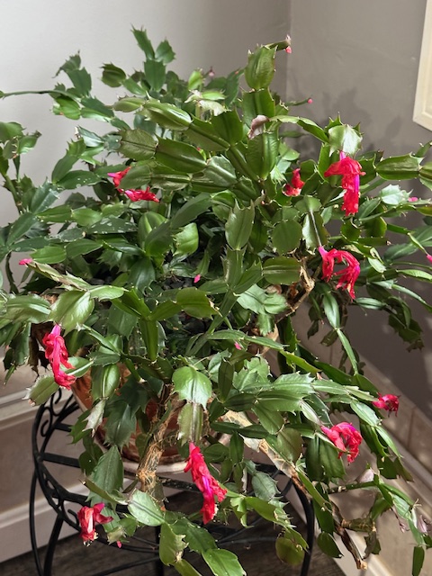I have two Christmas cactuses that were spawned off of my mother’s original plant and one of my own years ago. Later I took a cutting from the plant on the right (my original plant) and created the plant on the left. By combining two different rooted plants and putting them together they flower profusely because they marry – male and female. I like to think that some of this plant is still related to my mother’s original plant. The left plant is young and more vibrant than the one on the right which is more like me – getting older every day. It’s no longer as spry as it used to be! Haha! The hibiscus is 18 years old this year and is still going strong. I stopped my husband from cutting it down before he brought it into the house. It is quite large but I manage to squeeze it into the kitchen so I can enjoy the flowers all year round,. It has been delighting me with all its blossims!