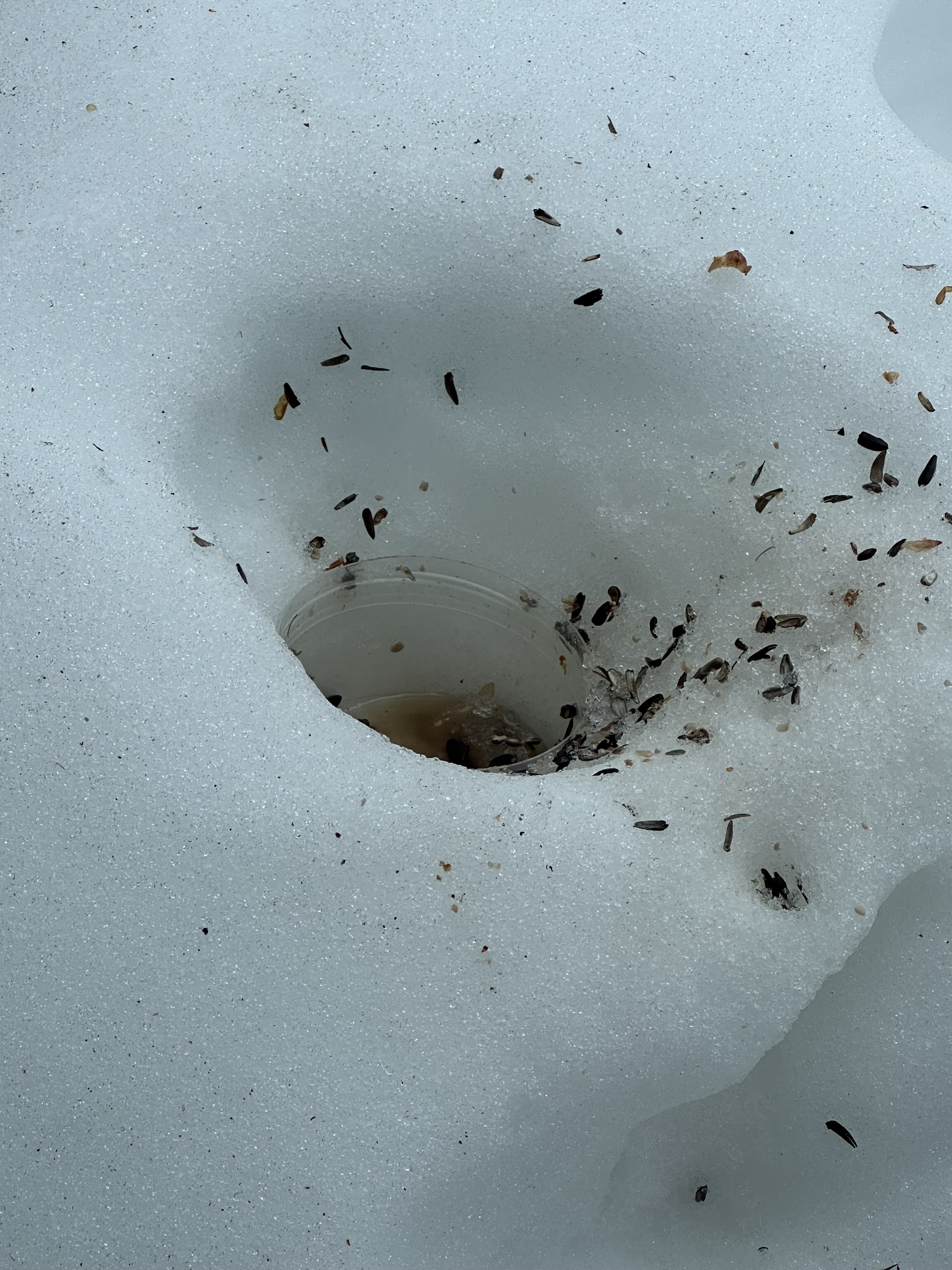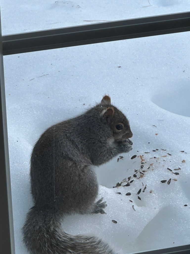 We still have plenty of snow but this squirrel doesn’t give up finding something to eat. My husband put a plastic container of seeds out on the back deck to attract the squirrels away from the feeders. That was before the foot of snow buried it. Well, recently the snow melted a little and some of it was uncovered enough for this tenacious squirrel to find it. I took photos and a video of this little guy feeding on the seeds. All creatures have to eat but it gets expensive to feed all the birds and squirrels too.