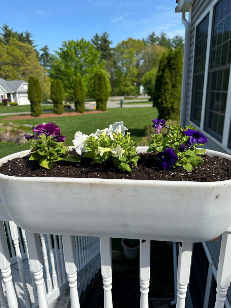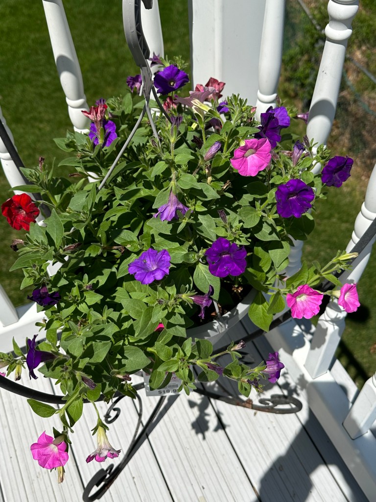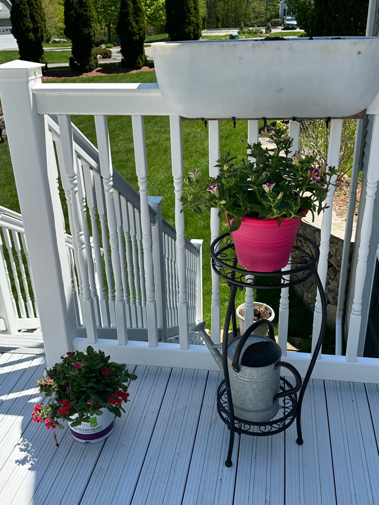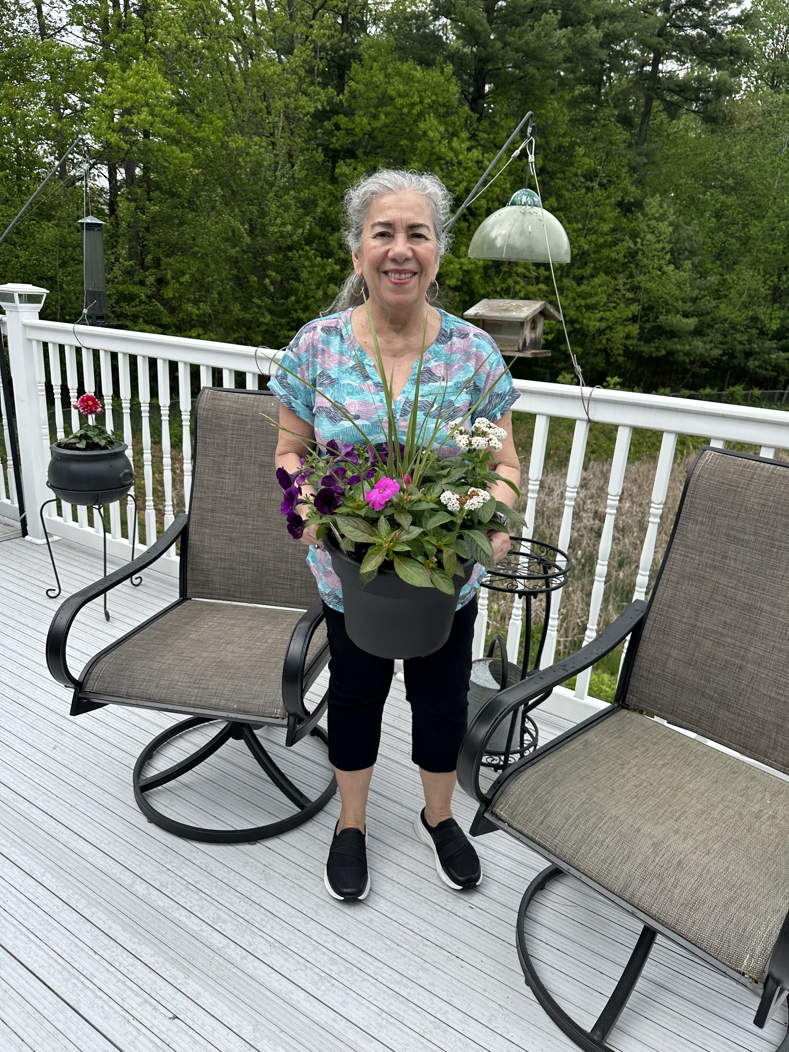 The inclement weather did not stop my husband from getting the deck ready. In between the rain on a good day, he put out the furniture and placed flowers pots around to make it as beautiful as he could. I think he did a wonderful job. The last two photos are of me holding my Mother’s Day plant from my son and daughter-in-law and one of the indoor plant from my daughter and family.