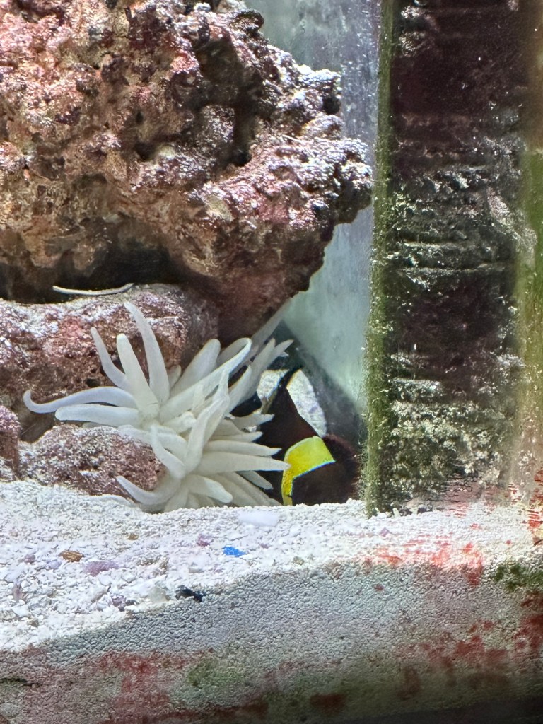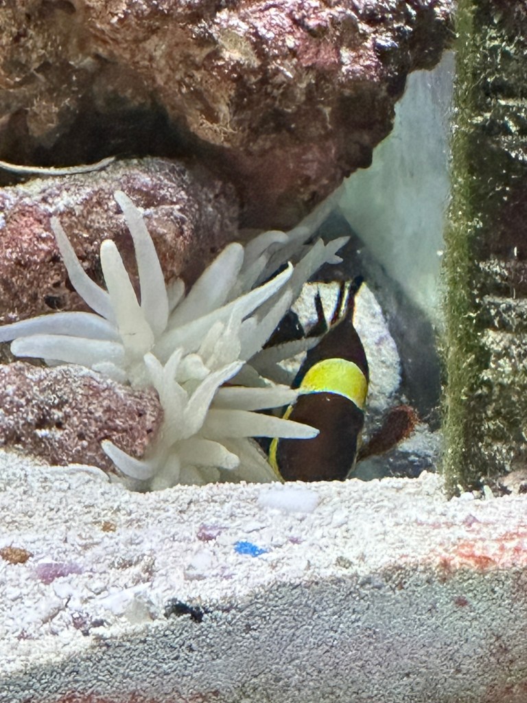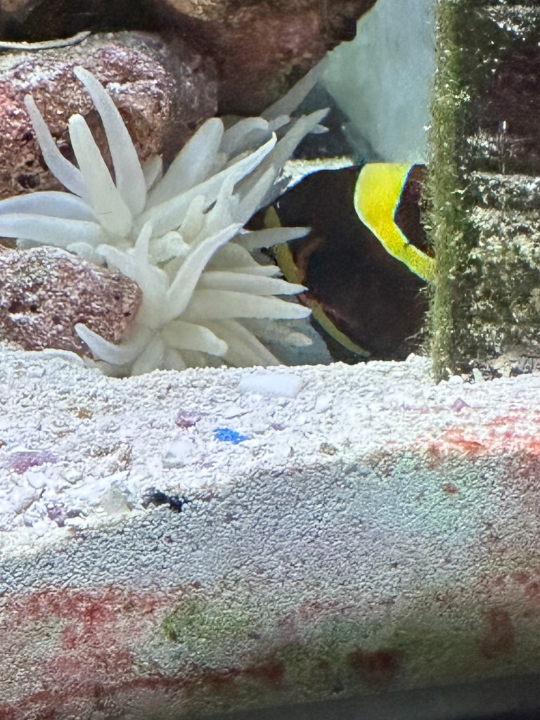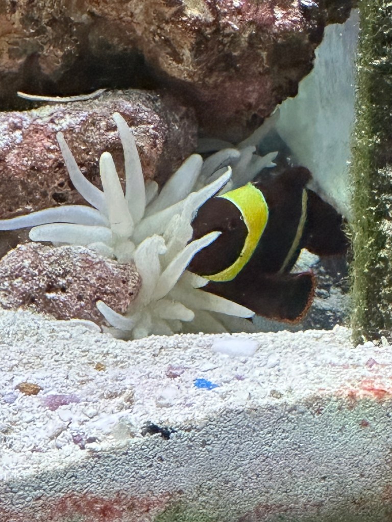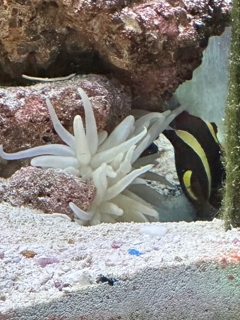 Updates on our new additions to our fish tank – our Clown fish finally came out of hiding to check out the anemone for the first time, that we noticed. He could have been looking at it during the night.
