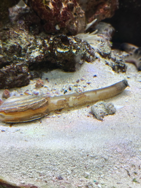 Now that we don’t have any large fish, it did not bury itself or try to hide. It felt safe and spread out its nose or leg to grab some nourishment in the water. The Clown, Anemone, Starfish and Gramma Basslet are together in the back and keeping an eye on it. They may not know what to do with it! Haha! If the clam can get enough nourishment from the water, then it can live a long time. It will eventually dig itself into the gravel and pull out some leftover food that it can find there. I never knew it could stretch that long!