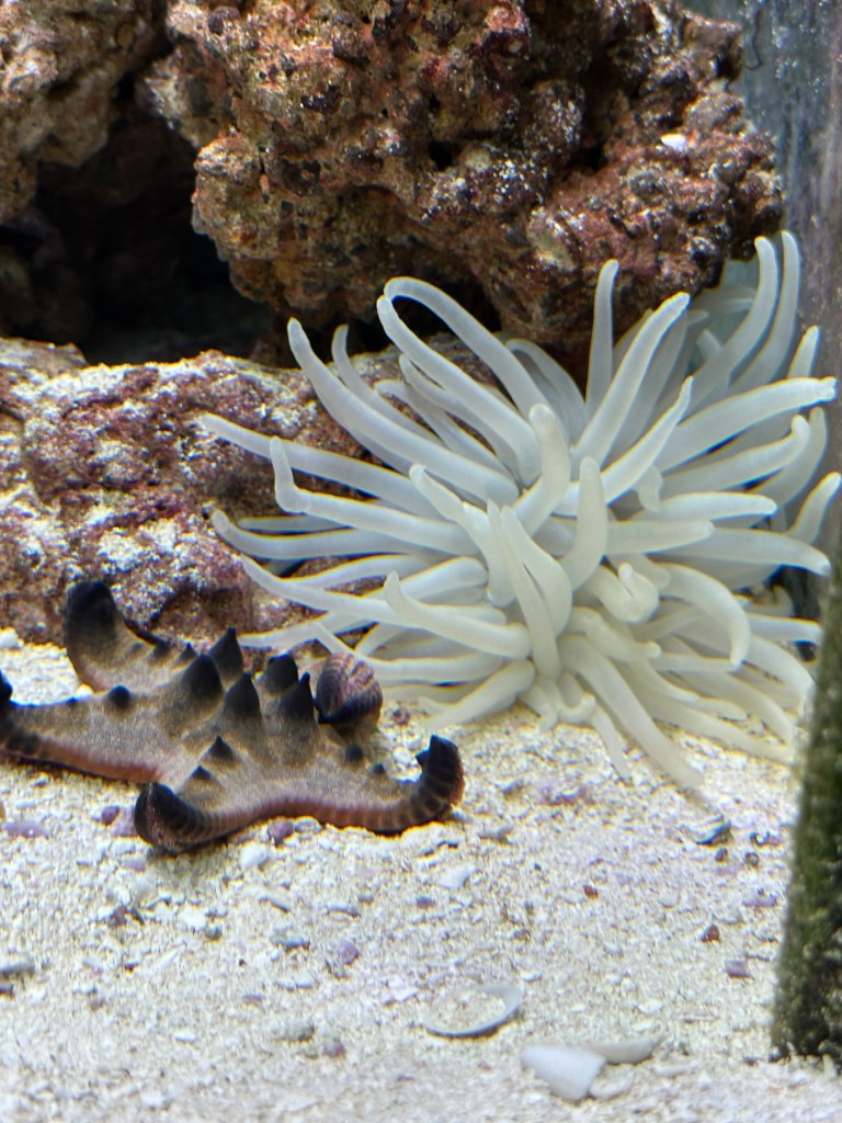 I looked everywhere for it and finally spotted it in the back of the tank near the anemone. It didn’t look good though. Its legs were pale pink and dried out. Not a good sign. John cleared out the tank and couldn’t find it. It appears that the anemone ate it – the whole starfish leaving nothing behind. Yikes! The anemone is looking larger and healthier than ever!