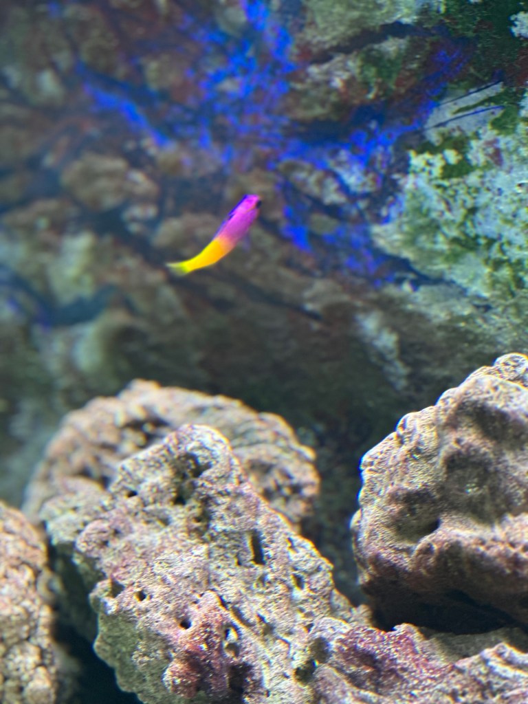 We did lose one of the previous additions – a Powder Blue Tang. It was so beautiful but it died after a fright. It was not used to having a light on in the tank. When my husband put on the light to feed them one day it got frightened and flew up and down hitting against a rock and passed away shortly thereafter. So sad.