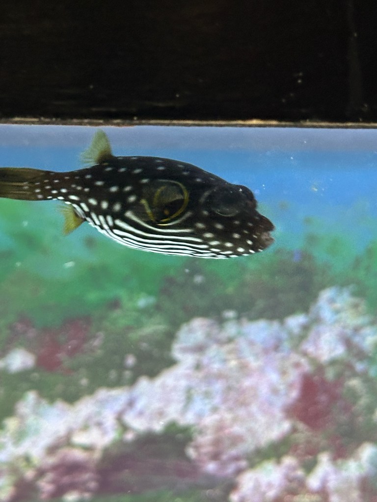 Puffer is keeping out of all this drama. It stays by itself and ignores everyone except John and I when we go visit it. I guess I could call all these fish a he but who knows? I don’t! Puffer is sweet and goes right up to the glass to see you and listens when I talk to him. I love puffers. They are very interactive with humans. Maybe it’s because they are always hungry and have enormous appetites. He is incredibly forceful when he goes after the food that is thrown into the tank. He attacks it like it’s the best thing he ever tasted. He is already growing larger.