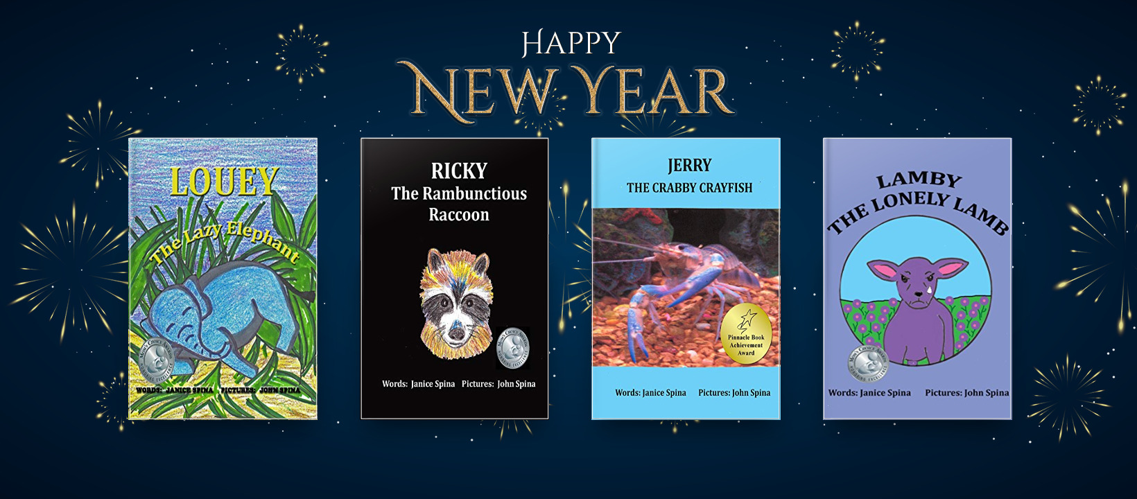 A promotional graphic featuring four children's books by Janice Spina, each displaying colorful covers and titles, set against a dark blue background with fireworks, celebrating the New Year.