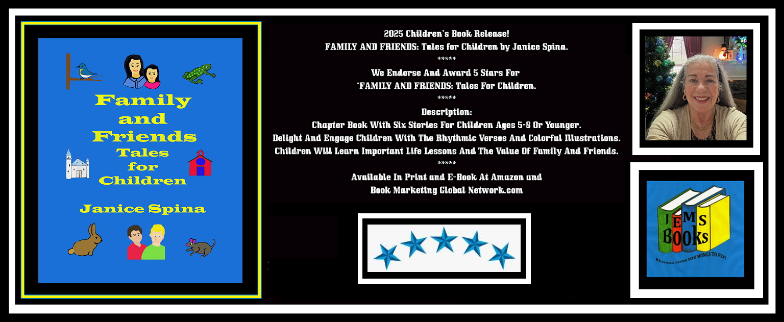 Please help me celebrate this memorable time. I will be giving away two books from my 50 books – a children’s book and a novel for 18+. If you would like a chance to win one of these books, please send me an email with FREE BOOK in the Subject Line to jjspina@comcast.net today. The first two emails I receive will each win one of these books. This is for USA only, sorry everyone else. I will announce which two books that will be given away afterwards.